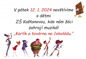 V pátek 12. 1. 2024 půjdeme s dětmi do ZŠ Kaštanové na muzikál "Karlík a továrna na čokoládu."