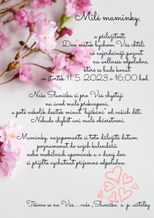 Srdečně zveme maminky "Sluníček" na "wellness" odpoledne u příležitosti Dne matek ve čtvrtek 11. 5. 2023 v 16,00 hod.