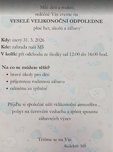 Srdečně Vás zveme na velikonoční akci, která proběhne v úterý 31.3.2026 na zahradě naší MŠ.