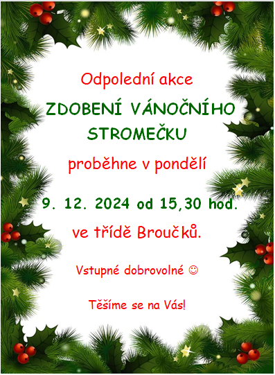 Srdečně zveme rodiče a jejich děti na odpolední akci v MŠ - Zdobení vánočního stromečku, která proběhne v pondělí 9. 12.2024 od 15,30 ve třídě Broučků. Budeme se na Vás těšit!