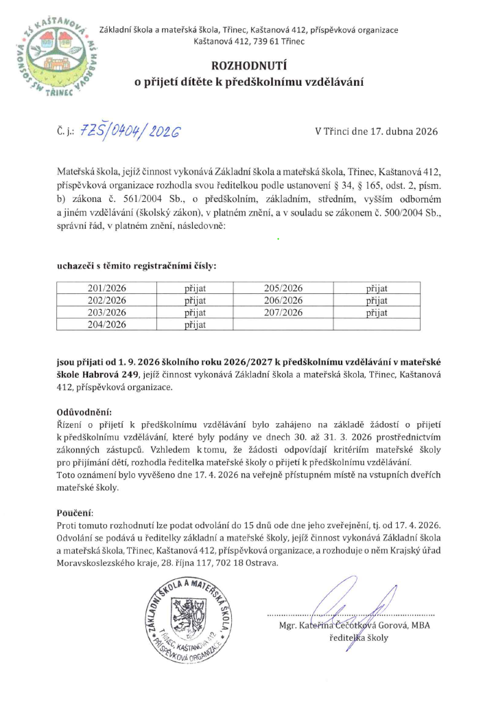 Rozhodnutí o přijetí k předškolnímu vzdělávání v mateřské škole Habrová 249 pro školní rok 2026/2027.