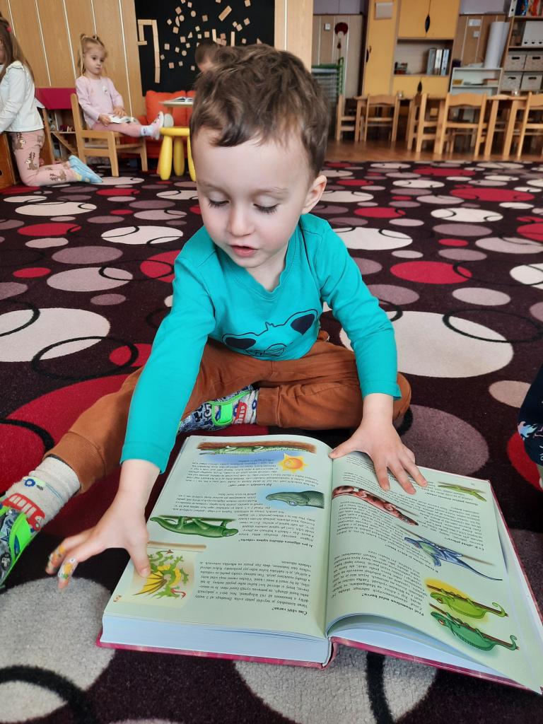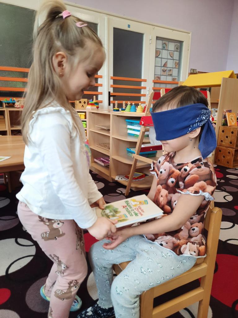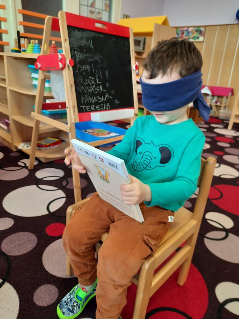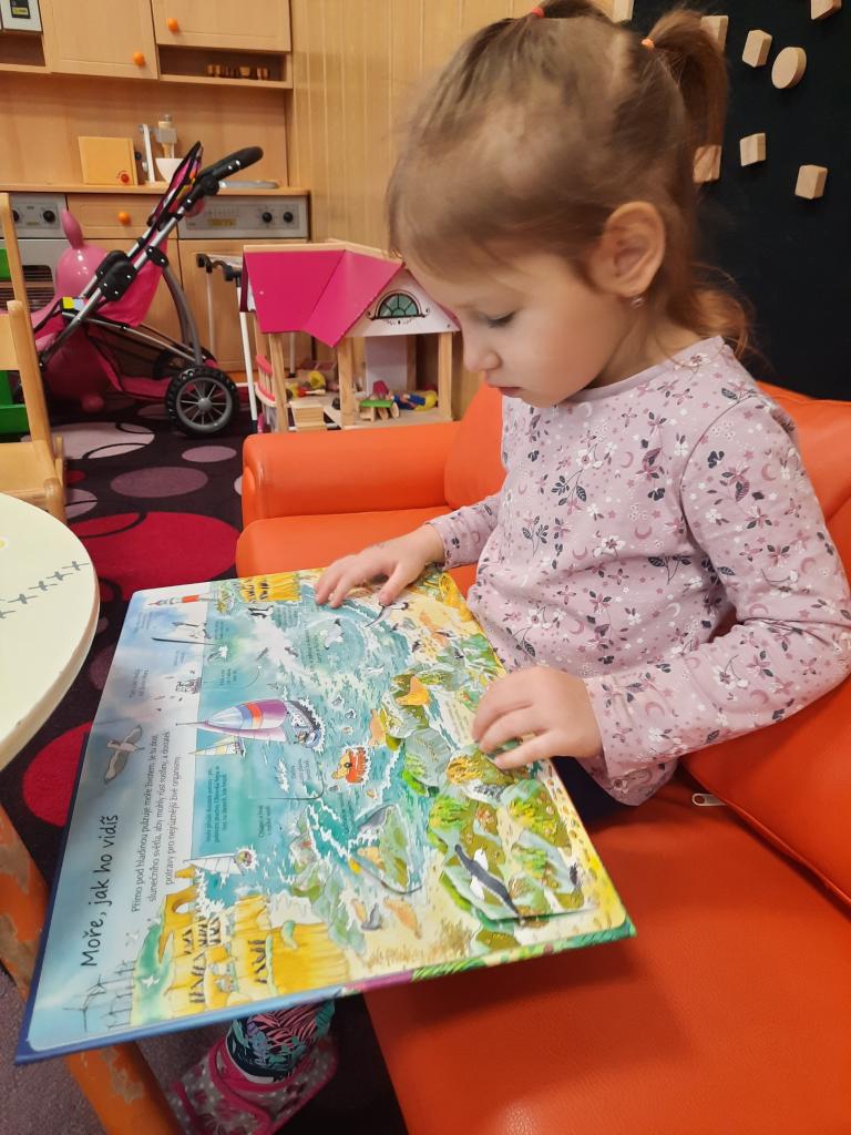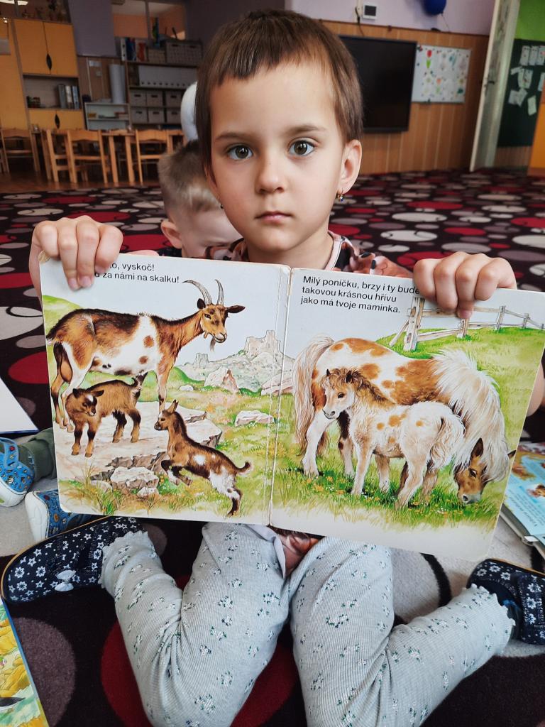 Prohlížíme si obrázky, čteme pohádky a různé příběhy, seznamujeme se s prvními písmeny. Hledáme v knihách ponaučení i zábavu. Hmatem rozlišujeme knihy a časopisy. Také si povídáme o tom, kdo knihy píše, z čeho jsou vyrobeny, jak s knihami zacházíme a jaký mají tvar. Baví nás pohybem znázorňovat knihy malé, velké, široké a úzké. A do knížek jsme si vyrobili hezké záložky.