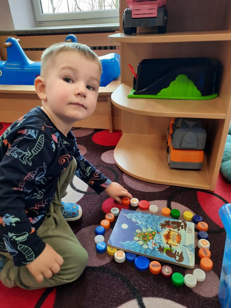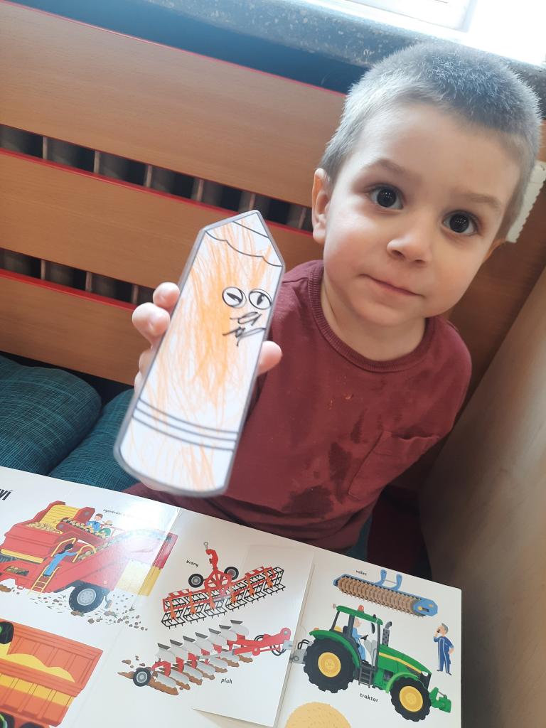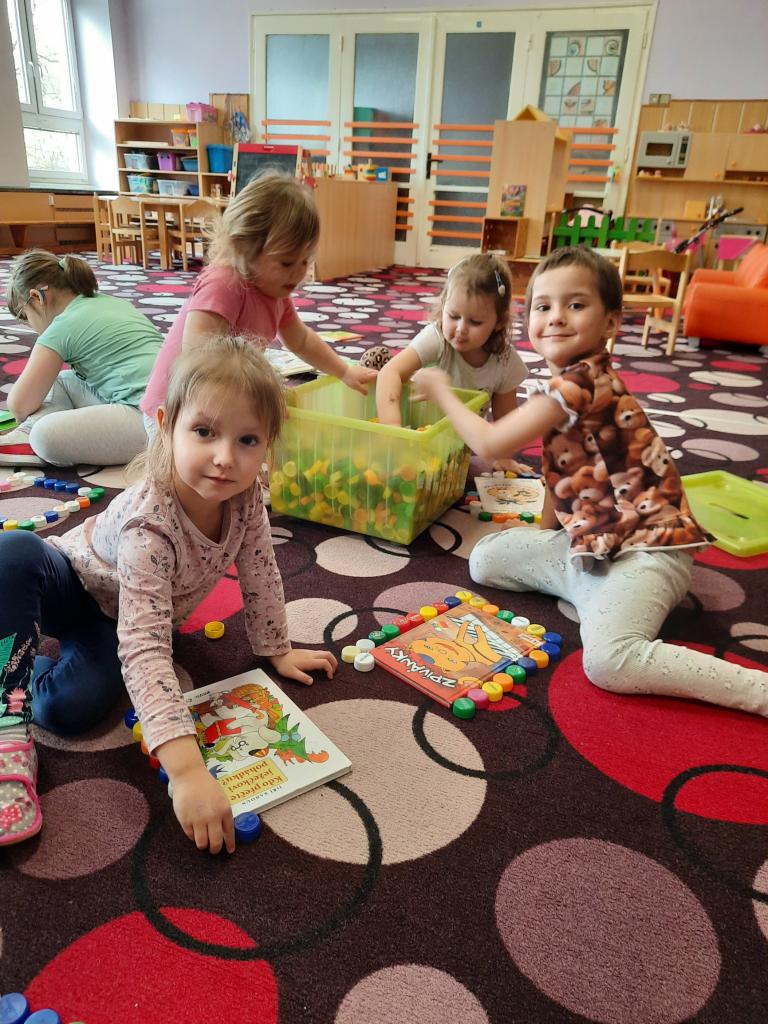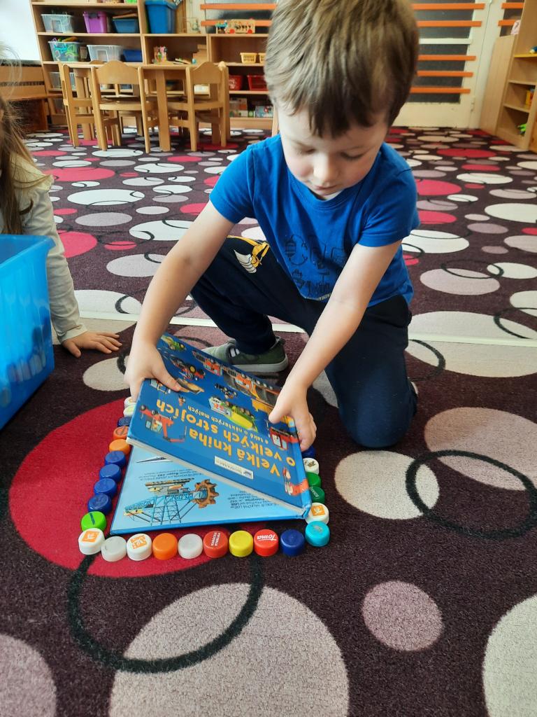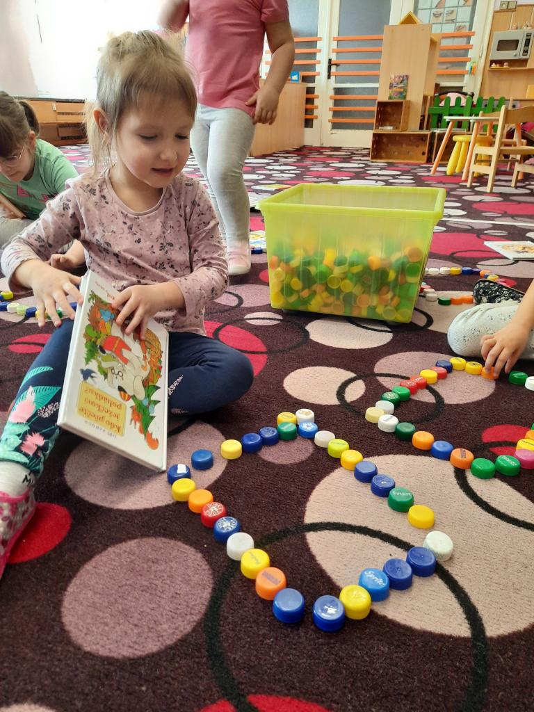 Prohlížíme si obrázky, čteme pohádky a různé příběhy, seznamujeme se s prvními písmeny. Hledáme v knihách ponaučení i zábavu. Hmatem rozlišujeme knihy a časopisy. Také si povídáme o tom, kdo knihy píše, z čeho jsou vyrobeny, jak s knihami zacházíme a jaký mají tvar. Baví nás pohybem znázorňovat knihy malé, velké, široké a úzké. A do knížek jsme si vyrobili hezké záložky.