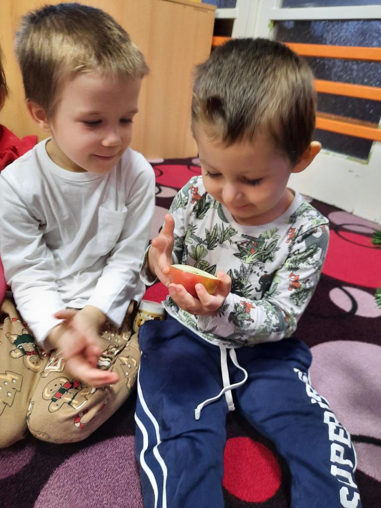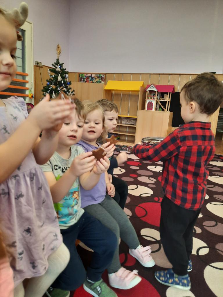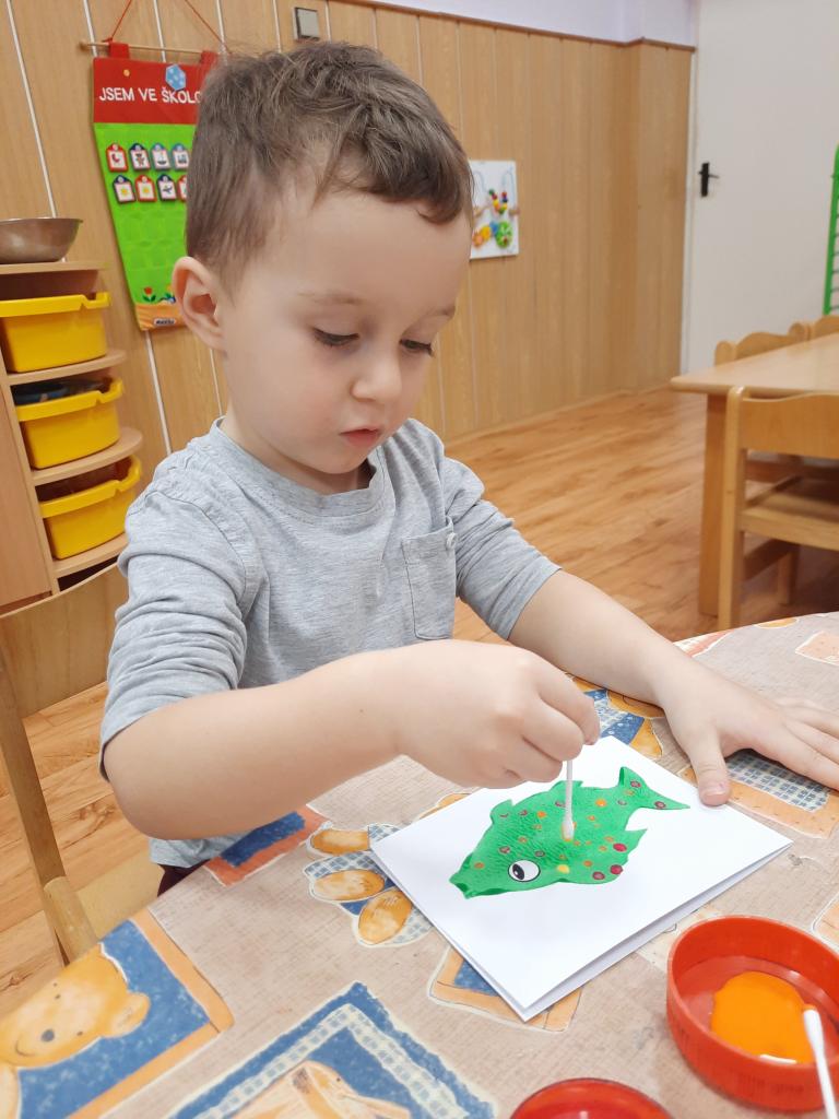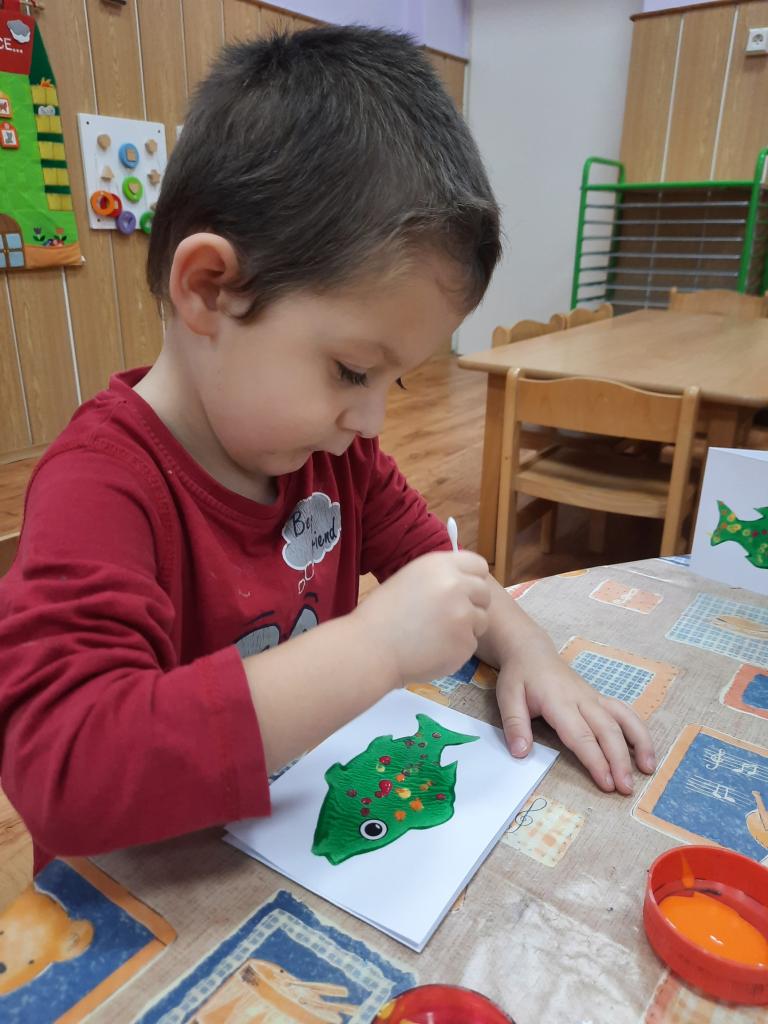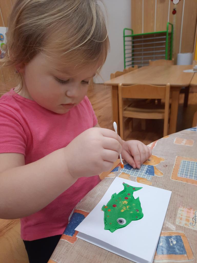 Povídáme si o Vánocích, jak se blíží a jak se na Vánoce připravujeme doma i ve školce. Líbí se nám různé vánoční zvyky a tradice. Po rozkrojení jablíčka jsme uviděli hvězdičku a pozorovali jsme, kam plují lodičky z ořechových skořápek. Také jsme si donesli do školky cukroví k ochutnání a sedíme při jídle u jednoho stolu. Zpíváme koledy, vánoční písničky, učíme se veselá říkadla. A tvoříme vánoční přáníčka pro rodiče. Letos otiskujeme a zdobíme kapříky.