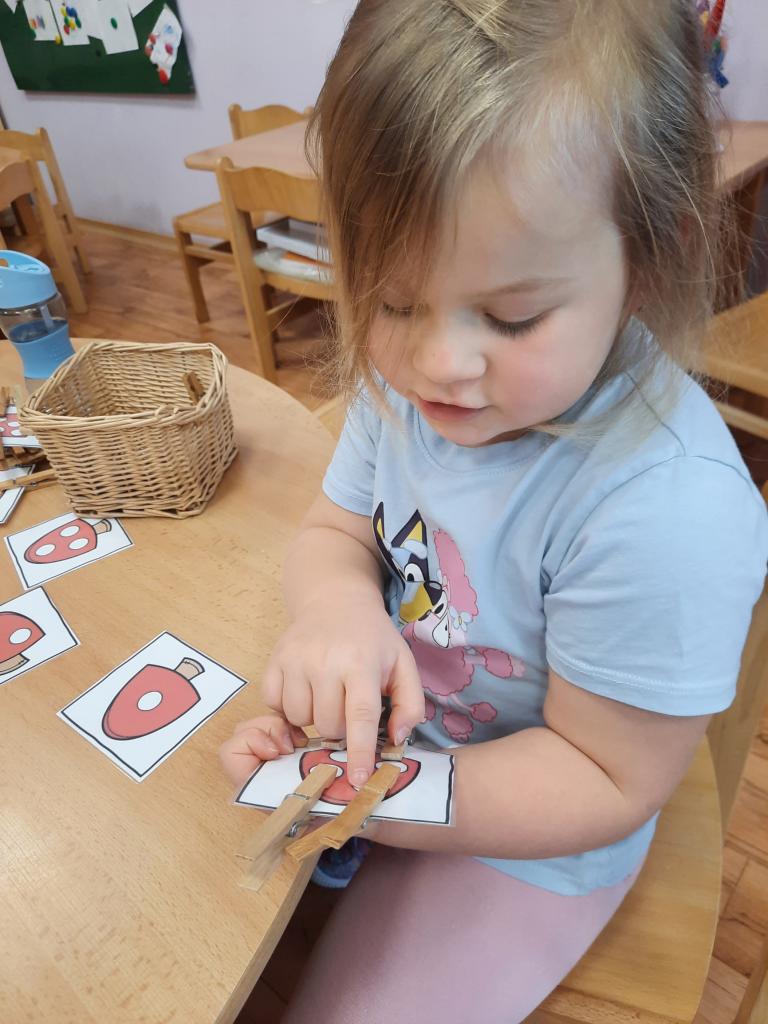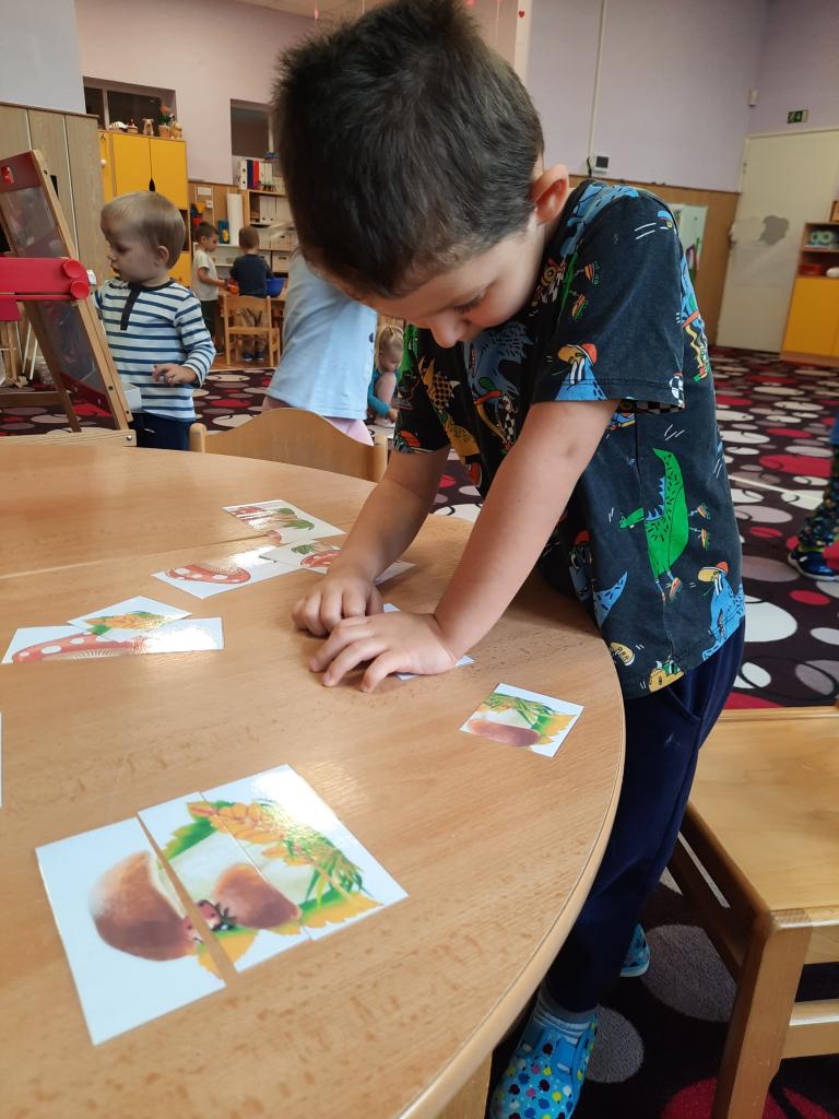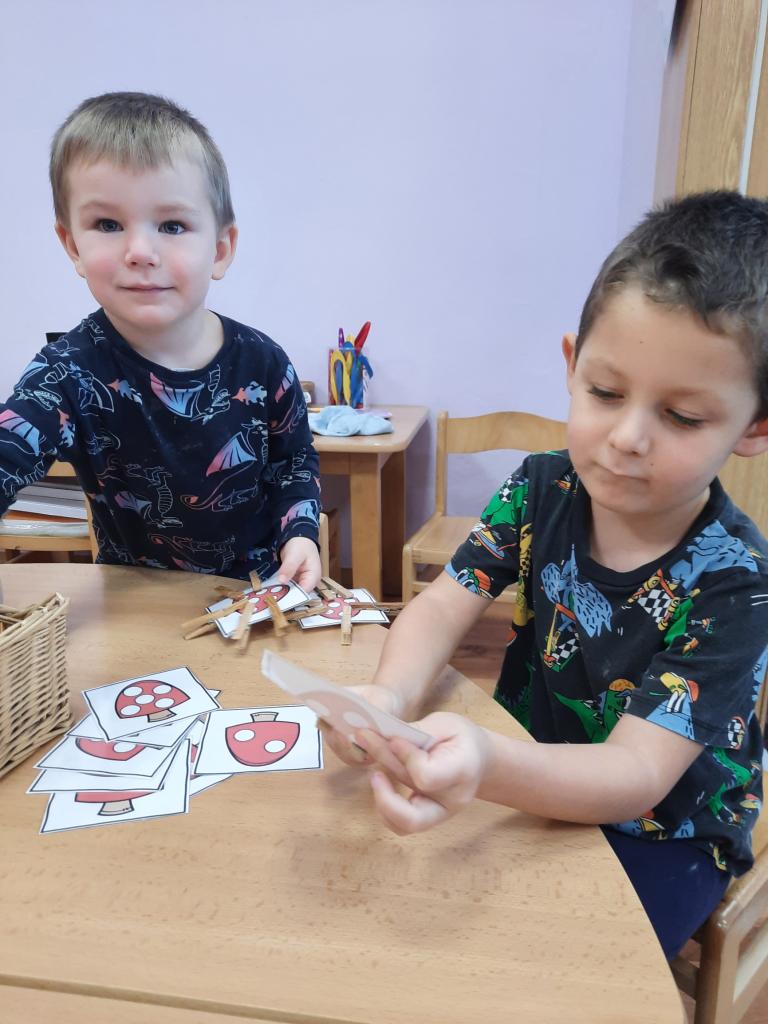 V lese rostou houby a my si s Broučky o houbách také povídáme. Moc se nám líbila hra „Na malého houbaře“, kdy jsme sbírali, počítali a porovnávali jedlé hříbky. Procvičili jsme si jemnou motoriku při třídění hříbků pinzetami, skládali obrázky hříbků z částí a přiřazovali kaštany na obrysy hub.