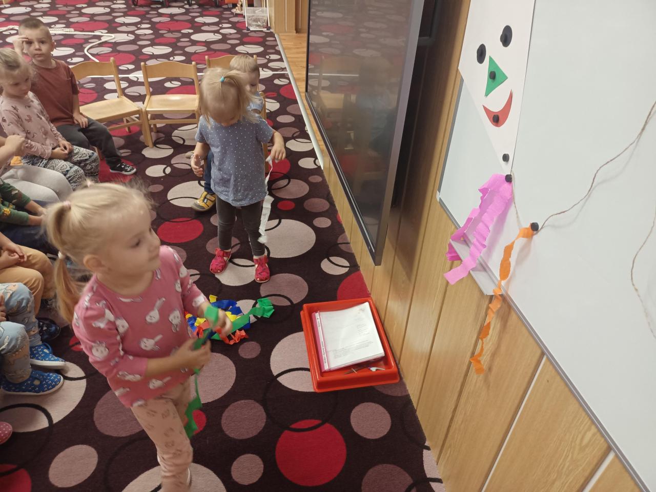 Na magnetickou tabuli společně sestavily papírového draka.