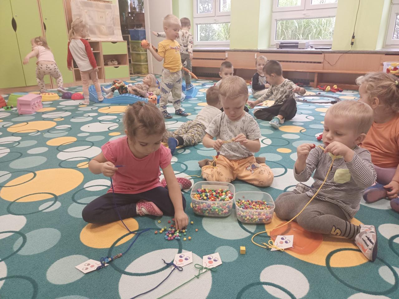 Ve skupinkách plnily dráčkovy podzimní úkoly – navlékaly korálky, stříhaly papír, přikládaly barevná víčka na kolečka stejné barvy.