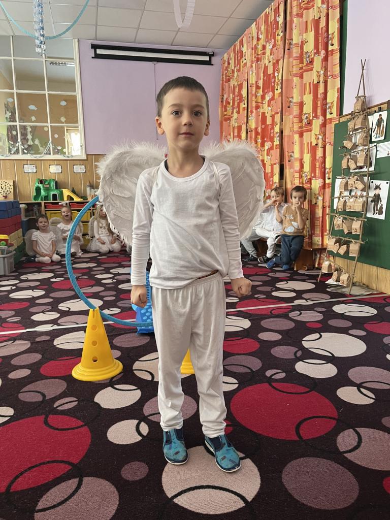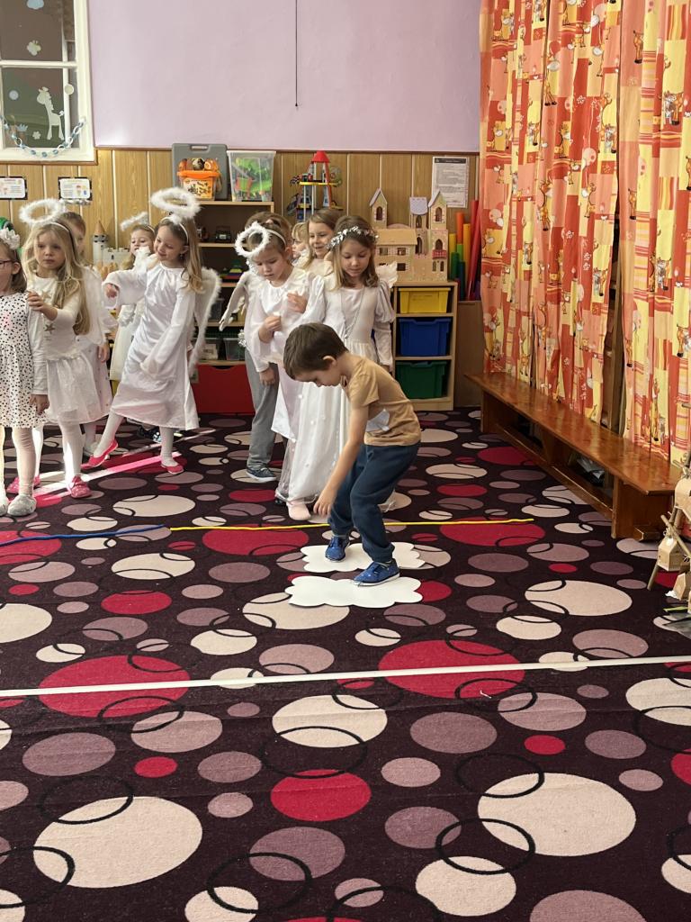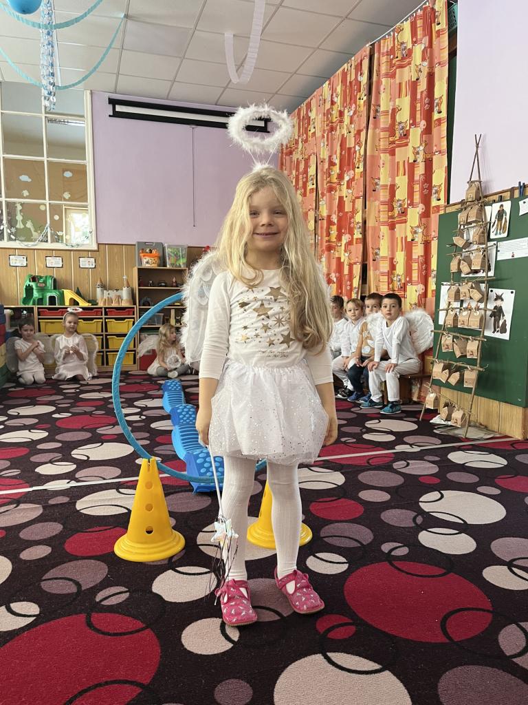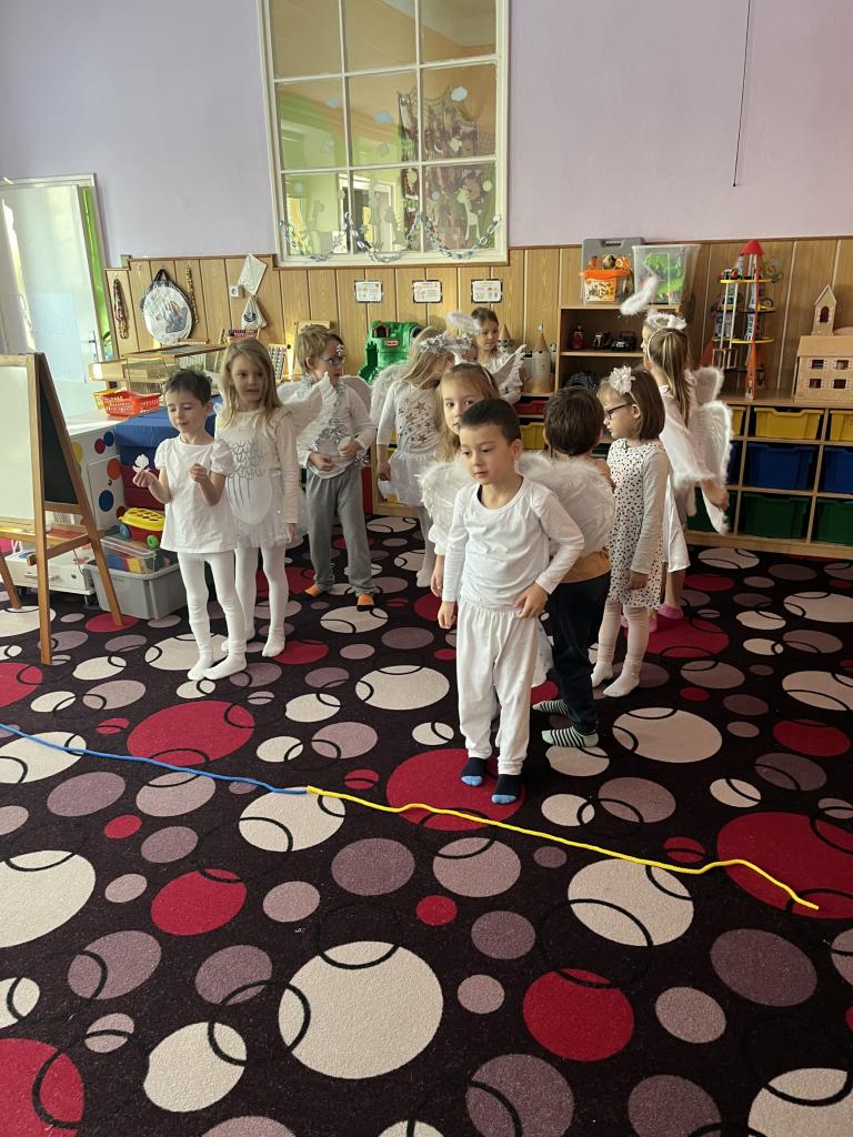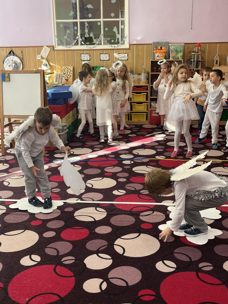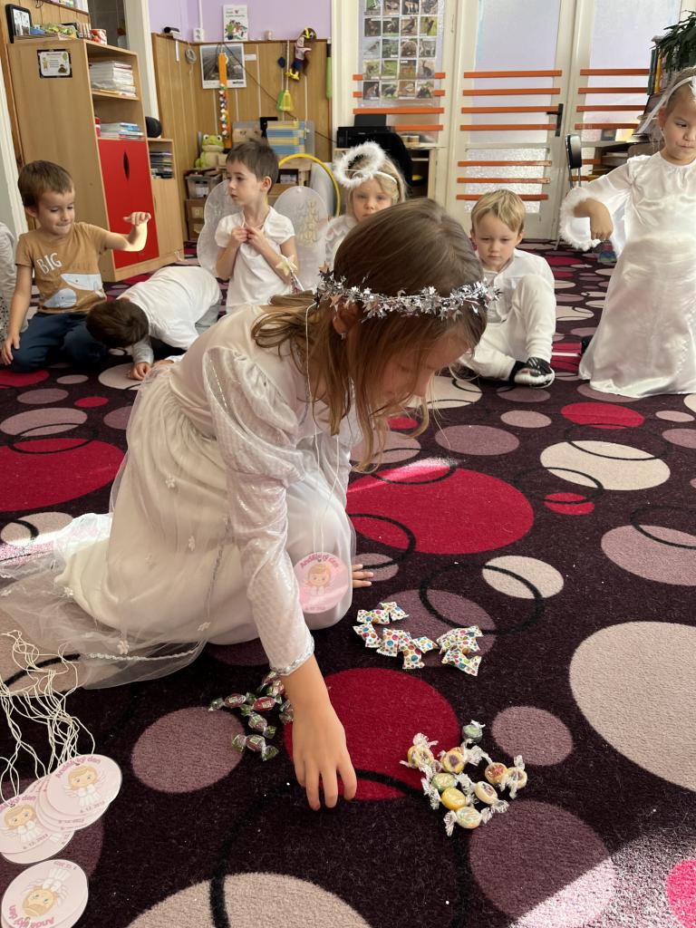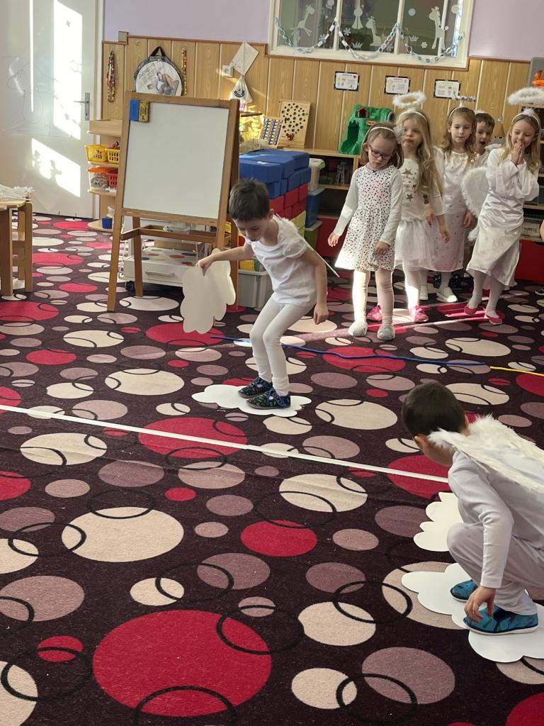 Dětičky měly krásné bílé oblečení a křidýlka plné peříček nebo třpytek, které se sypaly po celé školce a vše se krásně třpytilo 😊. Ráno jsme si zatančili na písničku s názvem „Andělé“. A abychom neměli hlad a také načerpali sílu na hry, které nás čekaly, museli jsme se jít nasvačit a poté hurá na to. Začali jsme jak jinak než módní přehlídkou krásných andělských kostýmů a vstupem nebeskou bránou do nebe. Poté jsme se už mohli vrhnout na hry. Jako první měly děti za úkol najít v hromadě papučí své, co nejrychleji (v rámci jejich možností) je obout na nožky a vrátit se zpět ke svému družstvu. Dalším úkolem bylo přejít po obláčcích na druhou stranu a nesmět šlápnout na koberec, vypít brčkem pití, přehodit co nejvíc sněhových koulí na stranu protihráče. Podbíhat pod krycí fólii jako pod mráčkem, vždy ty děti, jejíž jména byly vysloveny. Na konci čekala na andílky medaile a malá sladká odměna. Více her se nám do dopoledne už nevešlo. Každý den totiž plníme úkoly z adventního kalendáře v podobě papírových chaloupek, a i dnes na nás jeden čekal. Kromě úkolu jsou v chaloupce i odměny pro děti 😊.
