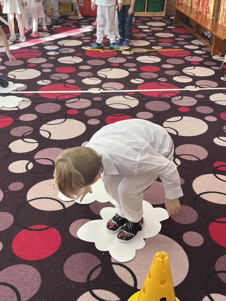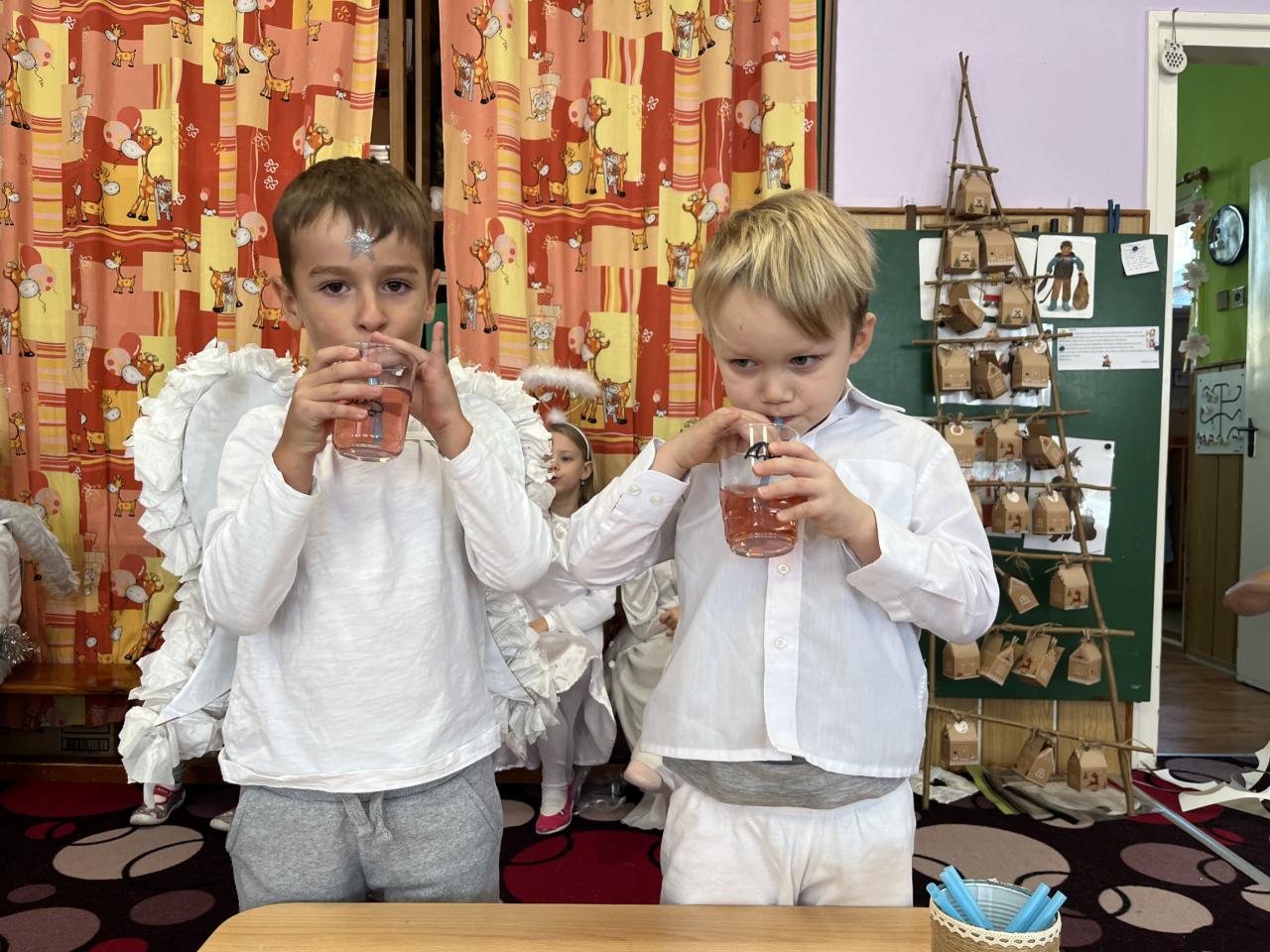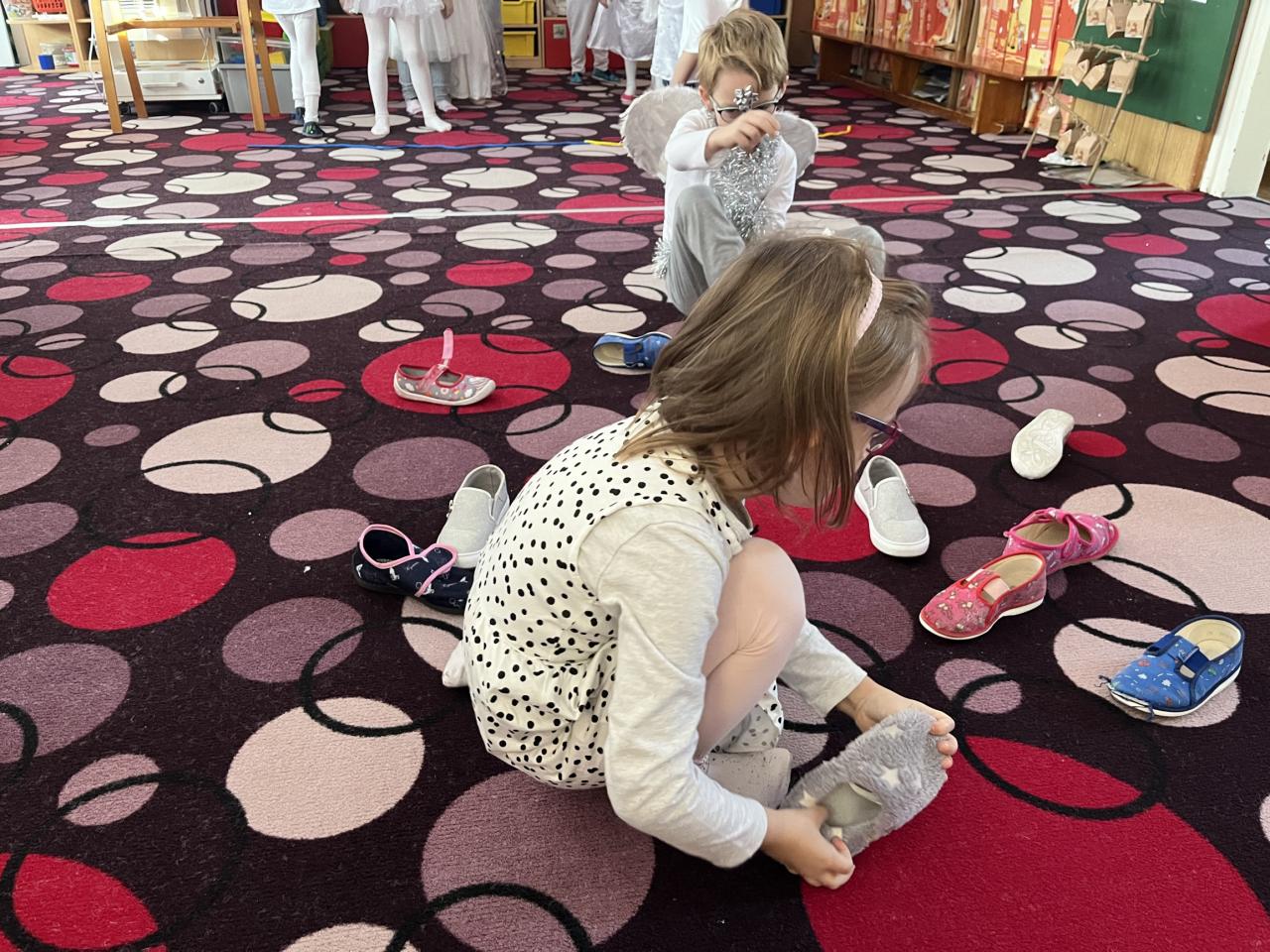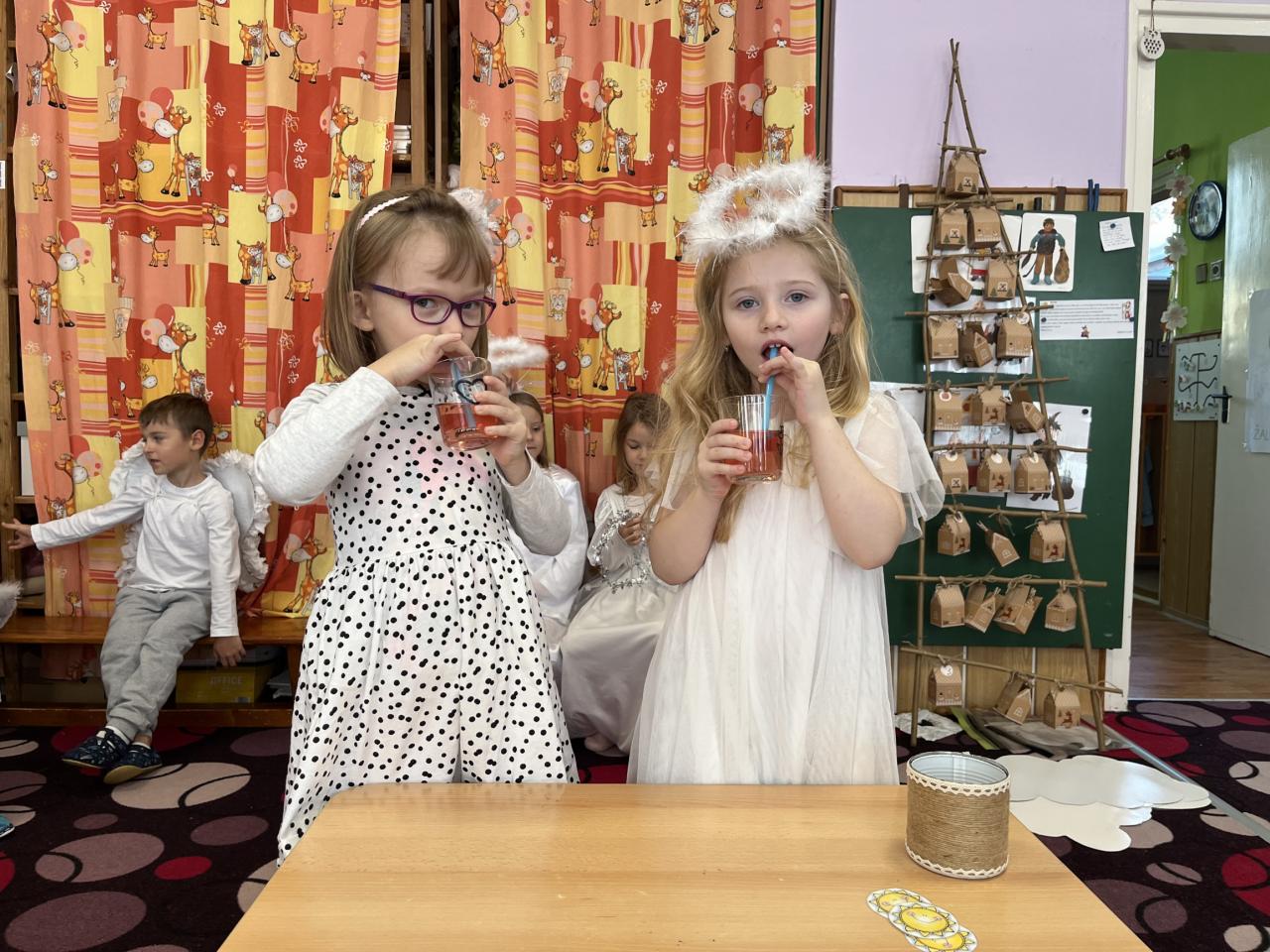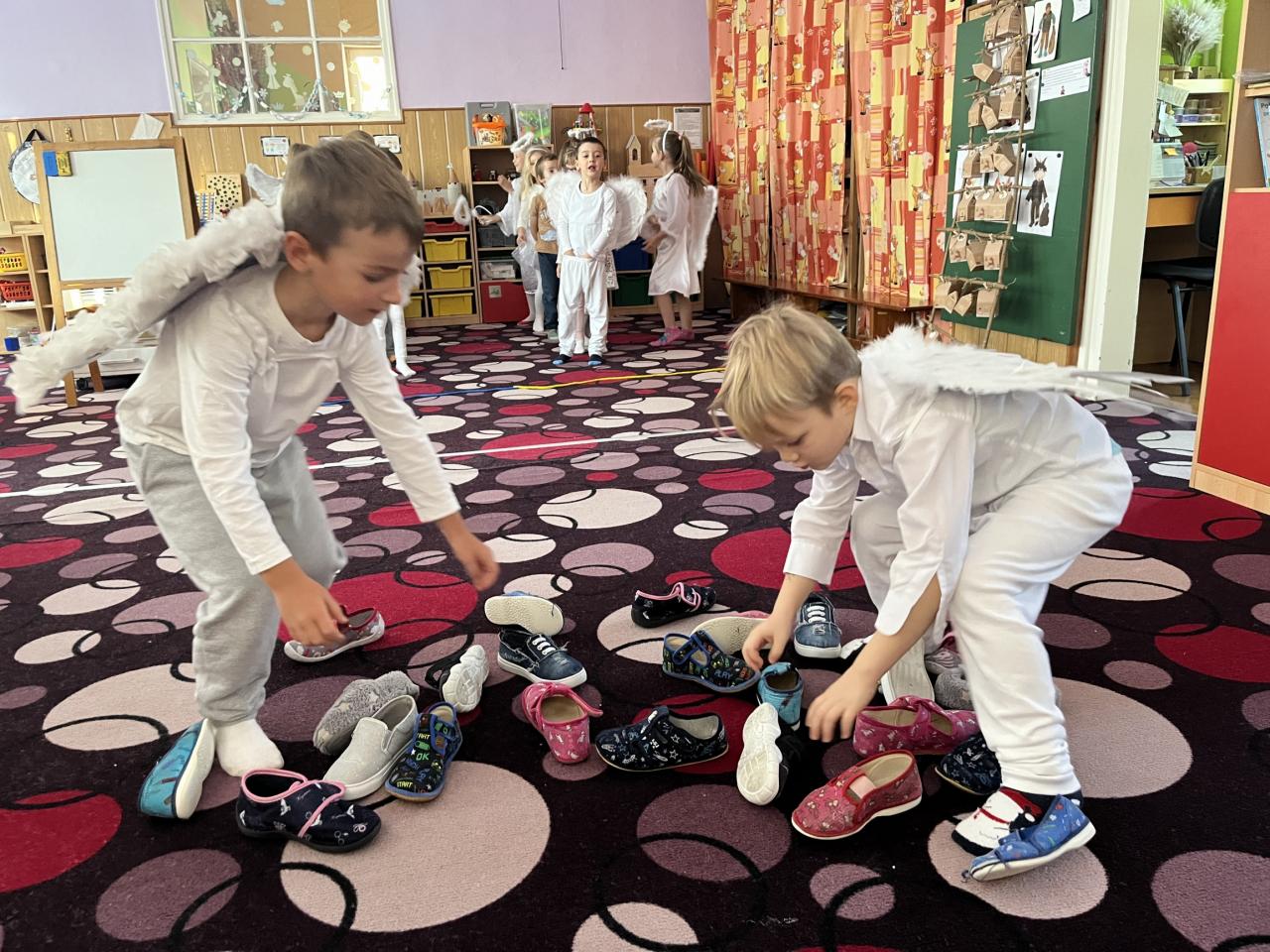 Dětičky měly krásné bílé oblečení a křidýlka plné peříček nebo třpytek, které se sypaly po celé školce a vše se krásně třpytilo 😊. Ráno jsme si zatančili na písničku s názvem „Andělé“. A abychom neměli hlad a také načerpali sílu na hry, které nás čekaly, museli jsme se jít nasvačit a poté hurá na to. Začali jsme jak jinak než módní přehlídkou krásných andělských kostýmů a vstupem nebeskou bránou do nebe. Poté jsme se už mohli vrhnout na hry. Jako první měly děti za úkol najít v hromadě papučí své, co nejrychleji (v rámci jejich možností) je obout na nožky a vrátit se zpět ke svému družstvu. Dalším úkolem bylo přejít po obláčcích na druhou stranu a nesmět šlápnout na koberec, vypít brčkem pití, přehodit co nejvíc sněhových koulí na stranu protihráče. Podbíhat pod krycí fólii jako pod mráčkem, vždy ty děti, jejíž jména byly vysloveny. Na konci čekala na andílky medaile a malá sladká odměna. Více her se nám do dopoledne už nevešlo. Každý den totiž plníme úkoly z adventního kalendáře v podobě papírových chaloupek, a i dnes na nás jeden čekal. Kromě úkolu jsou v chaloupce i odměny pro děti 😊.