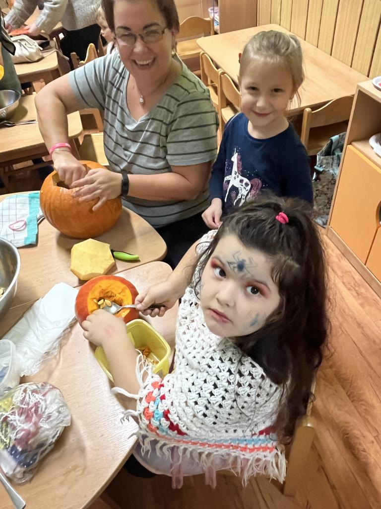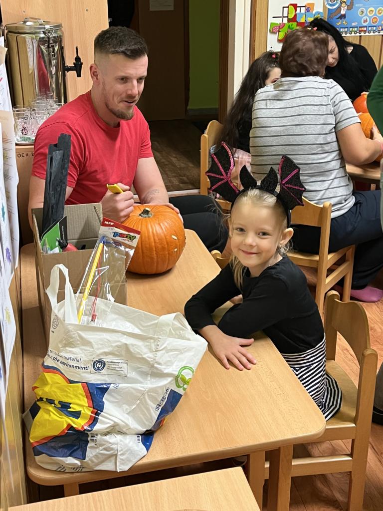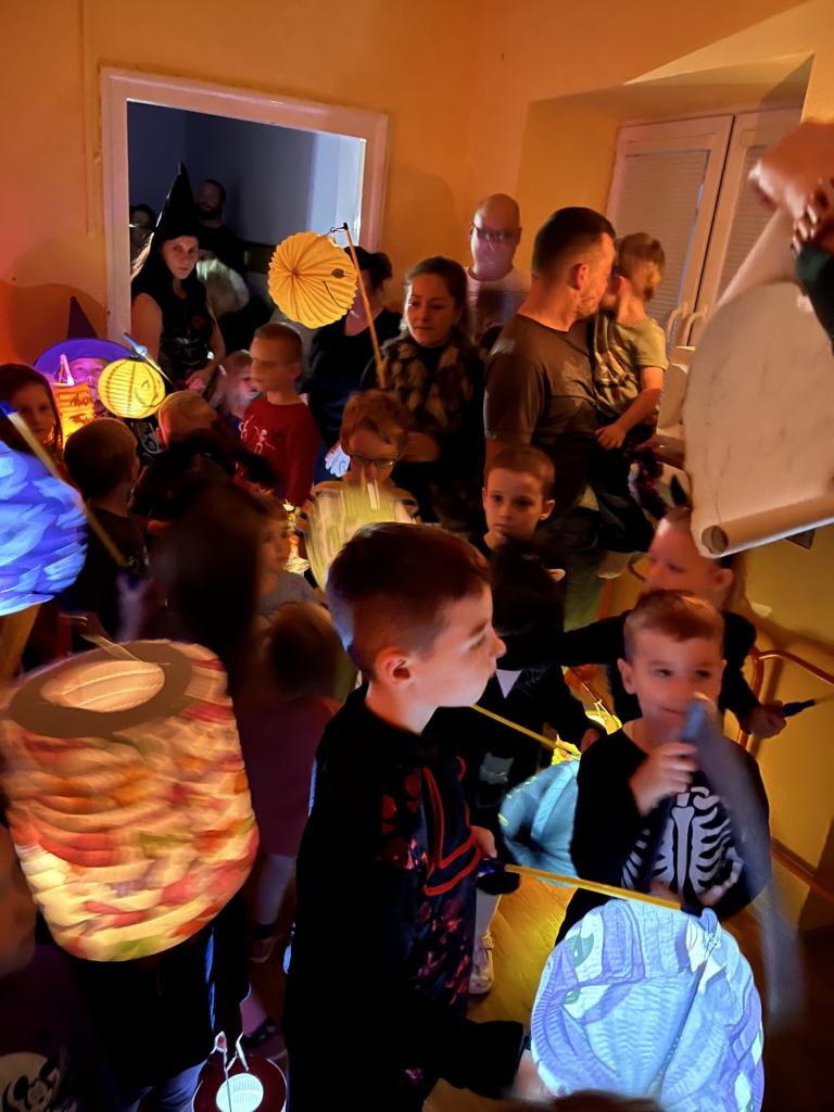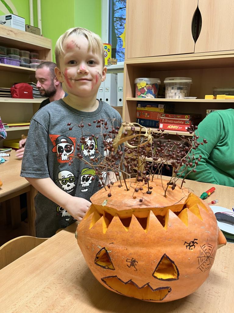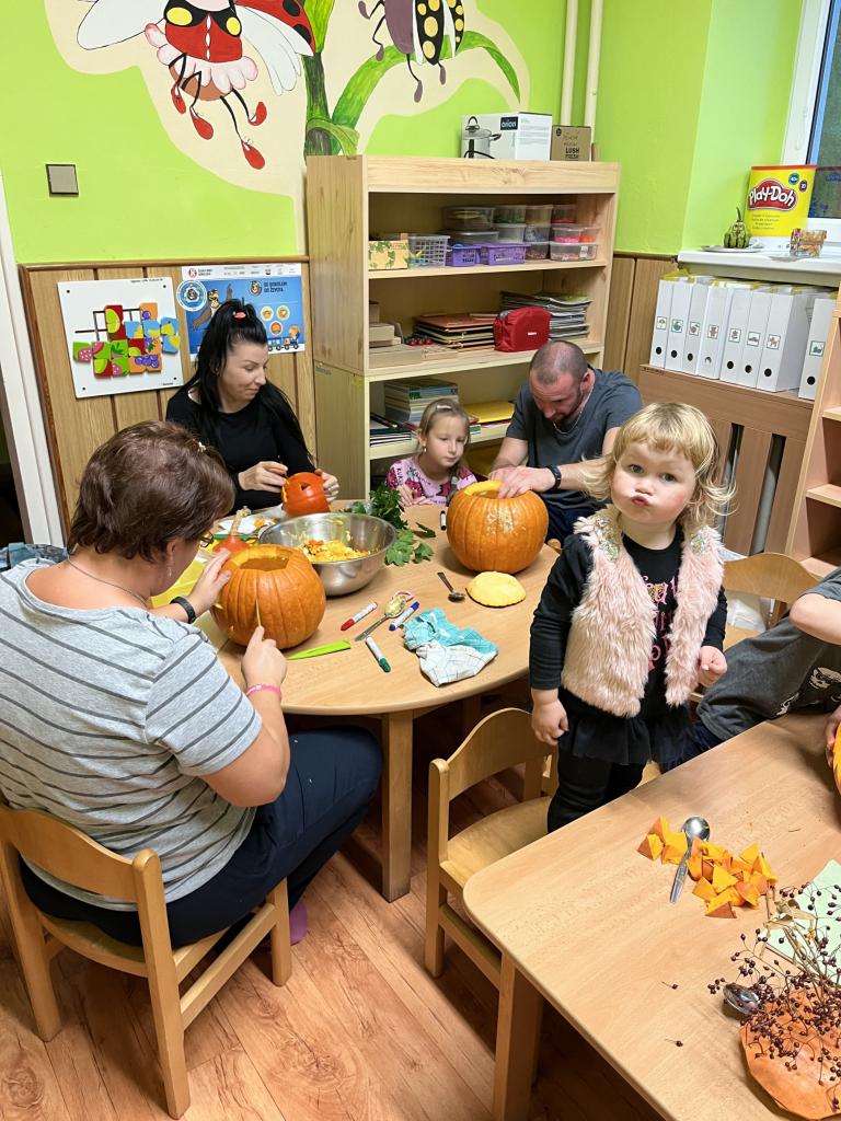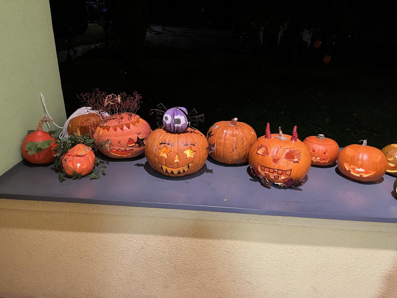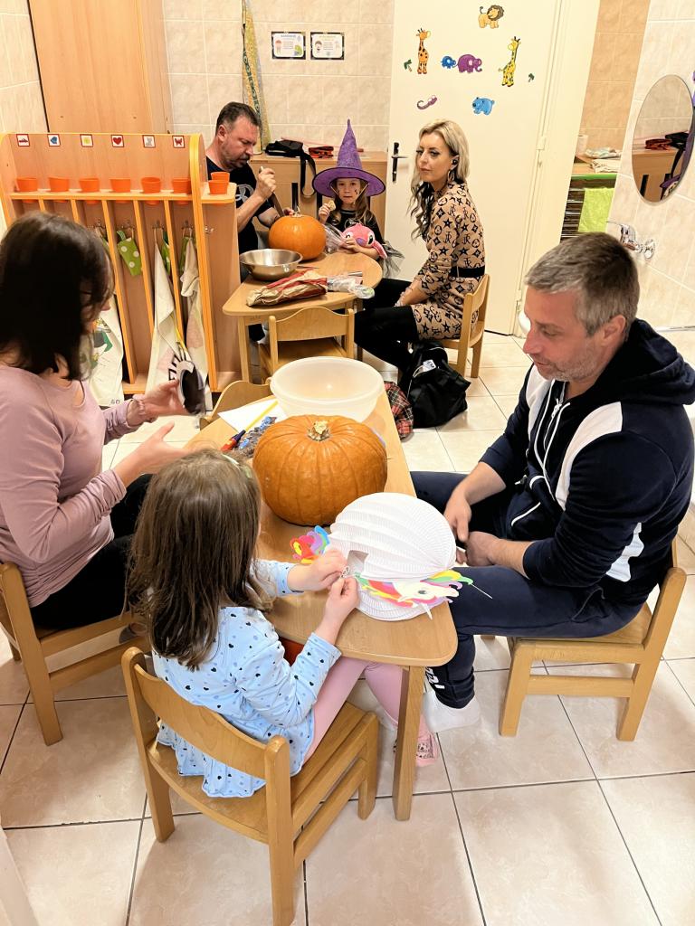 V úterý 31. října se v naší školce sešli rodiče a společně se svými dětmi dlabali dýně. No, abychom byli konkrétní, tak rodiče dlabali a děti si hrály 😊. Vydlabané a různě nazdobené dýně pak uložili na zídku před MŠ a každý si uvnitř rozsvítili svíčku. Poté se všichni vydali na lampiónový průvod po školce, jelikož nám nepřálo počasí a pršelo. Zatímco se účastnici procházeli, "hodný duch" naší školky, který vše tajně pozoroval, připravil dětem překvapení – sladkou dobrotu.