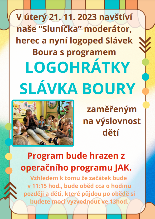 V úterý 21. 11. 2023 navštíví třídu "Sluníček" logoped Slávek Boura.