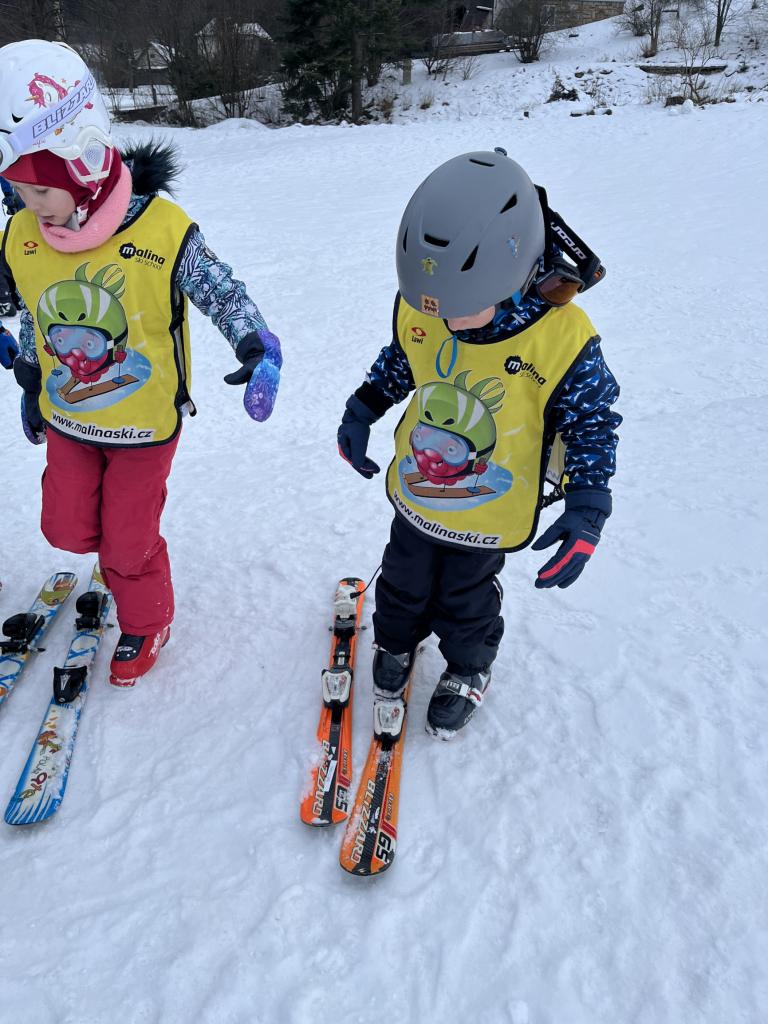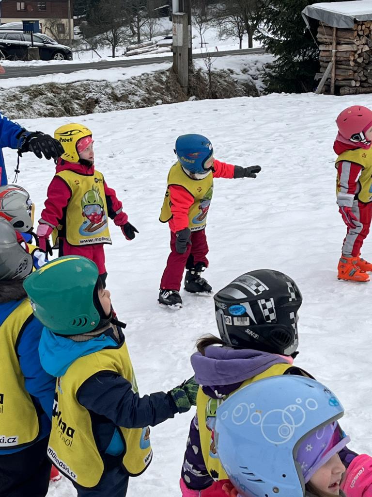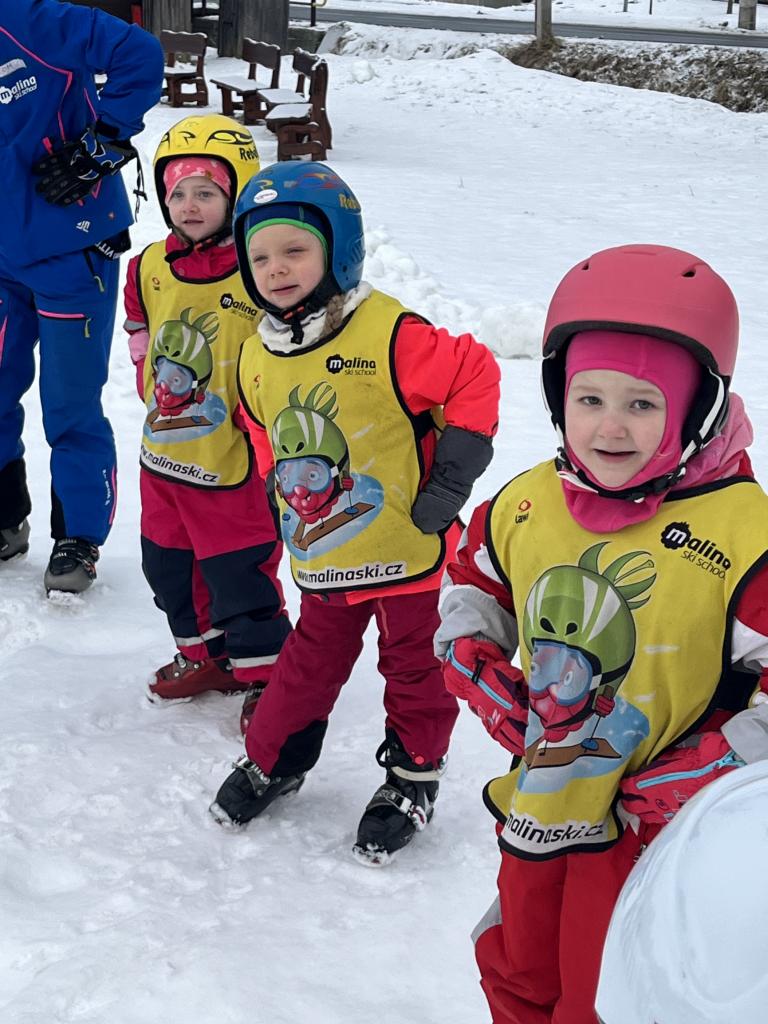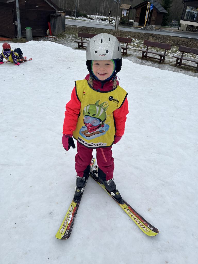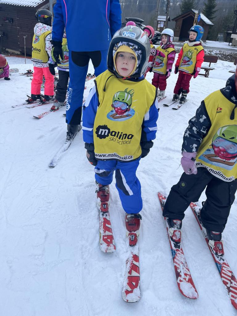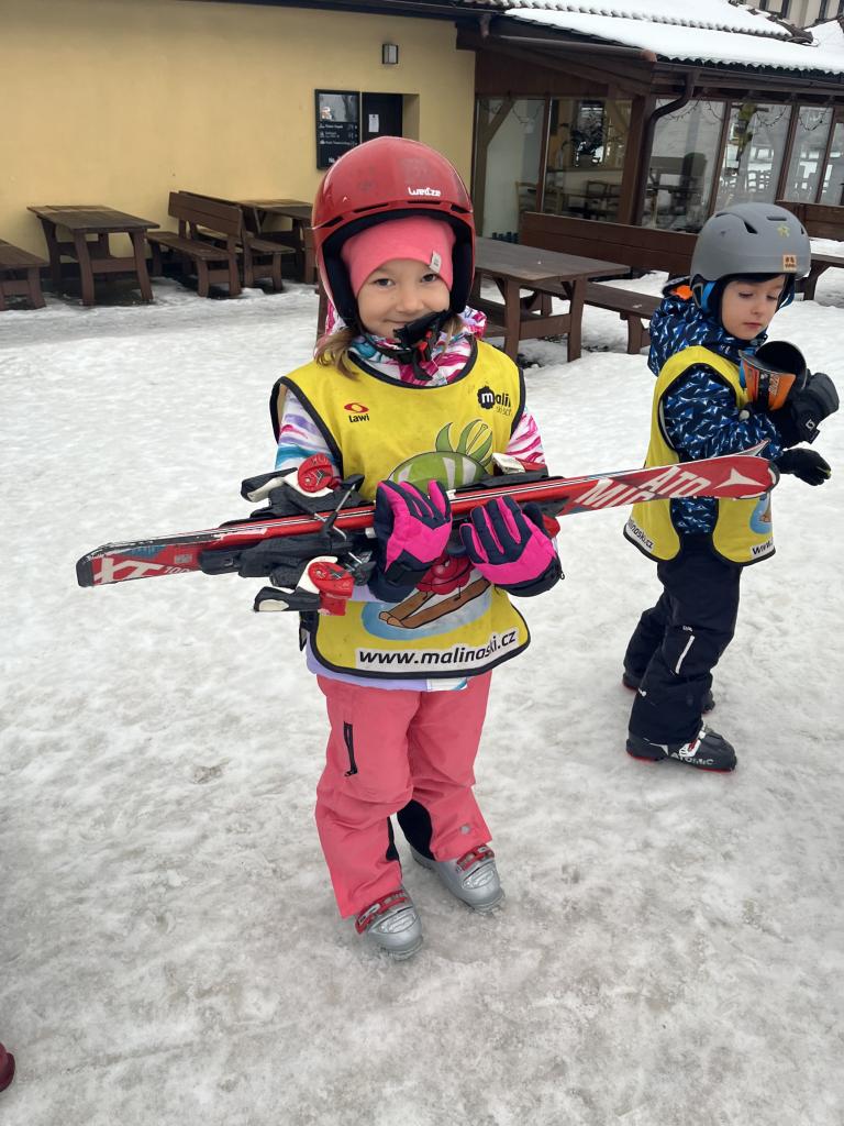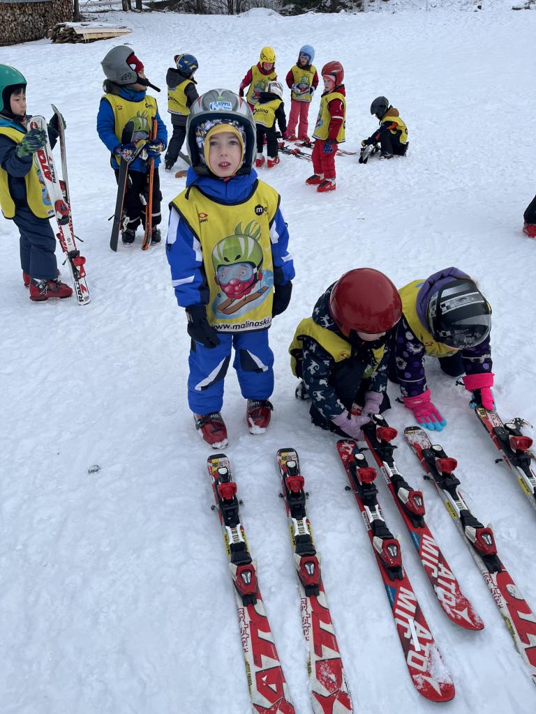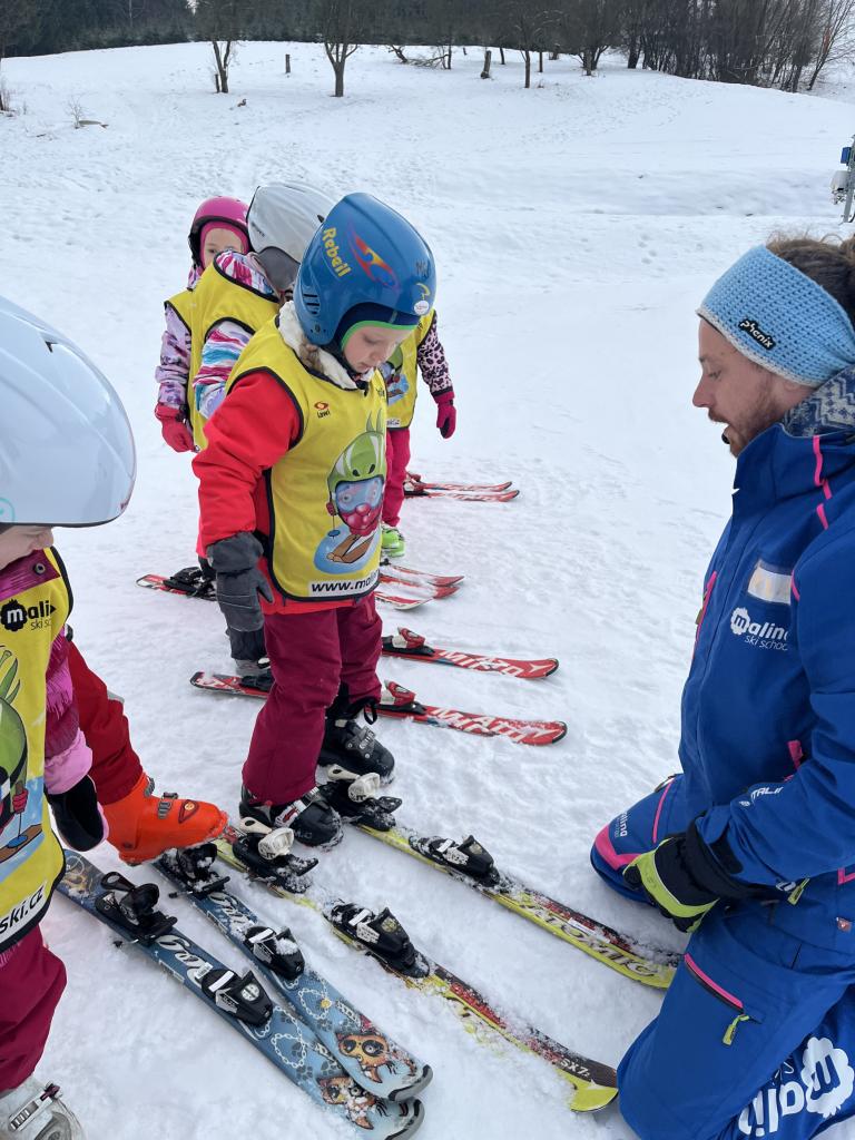 Cestou jsme se ještě stavili pro děti z MŠ Sosnové a Koperníkové. Každý den probíhal úplně stejně. Po příjezdu na místo dostaly děti vesty s obrázkem Maliny, poté si vzaly své podepsané lyže, na kterých jezdily pak celý týden a vydaly se s instruktory na rozcvičku. Po rozcvičce se věnovaly lyžování. První dny byly o seznamování s lyžemi. Nejdříve si nasadily jednu lyži, vyzkoušely si se na ní odrážet, pak i druhou. Děti, které to zvládly se posunuly o level výš a zkoušely na lyžích šlapat do kopce, padat a zvedat se. Po zvládnutí základů se mohly rozjet z malinkého kopečku a zkoušely zabrzdit. Každé dítě potřebuje na zvládnutí a osvojení si nových poznatků a zkušeností svůj čas. Někdo delší někdo kratší, a proto, aby se nebrzdily v rozvoji, byly rozděleny do družstev podle jejich možností a schopností. Den ode dne byly lepší a lepší, a proto se během týdenního kurzu přesunuly z menšího kopce na větší. Nejdříve se vyvážely na kopec na laně a později někteří na páse. Pokroky udělaly všechny děti a jen málo kdo potřeboval poslední den pomoct při sjezdu z kopce před „diváky“ rodiči 😊. Základy si osvojil každý a teď už se stačí jen zdokonalovat 😊. Moc děkujeme za to, že jste poslední den přišli všichni podpořit své děti a podívat se na to, co se za týden naučily. Pro děti to bylo to nejdůležitější. Ve školce na ně pak čekala sladká odměna ve formě medaile z fidorky, šampaňské a také mini ohňostroj 😊