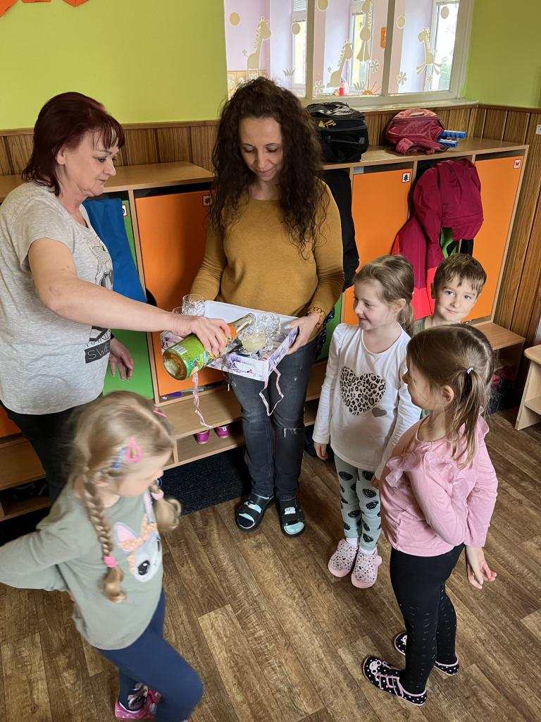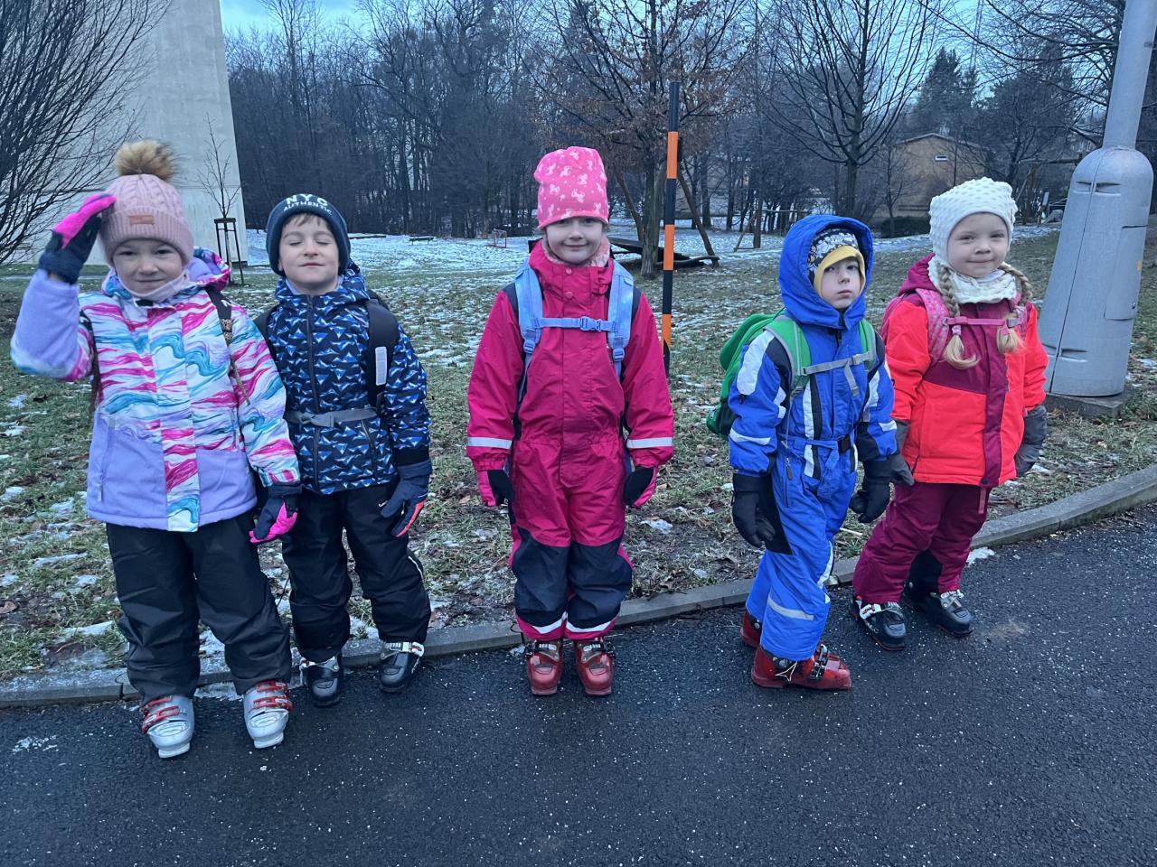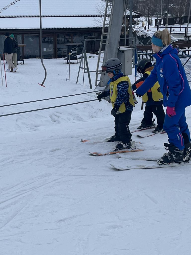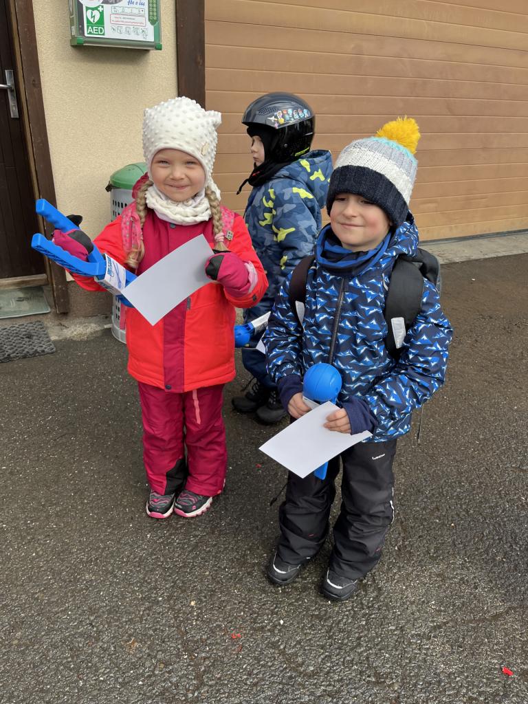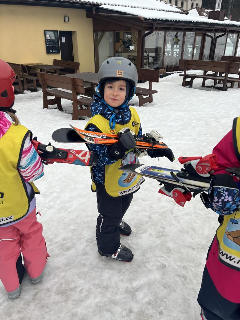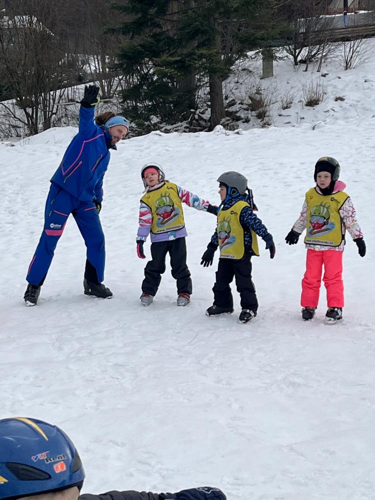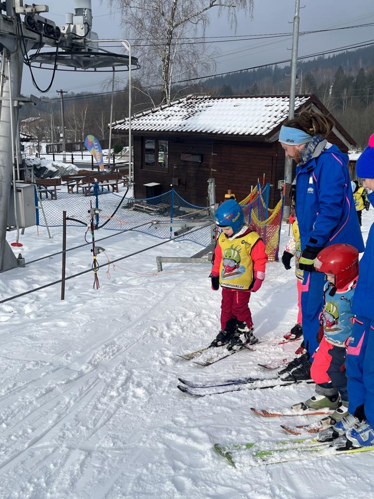 Cestou jsme se ještě stavili pro děti z MŠ Sosnové a Koperníkové. Každý den probíhal úplně stejně. Po příjezdu na místo dostaly děti vesty s obrázkem Maliny, poté si vzaly své podepsané lyže, na kterých jezdily pak celý týden a vydaly se s instruktory na rozcvičku. Po rozcvičce se věnovaly lyžování. První dny byly o seznamování s lyžemi. Nejdříve si nasadily jednu lyži, vyzkoušely si se na ní odrážet, pak i druhou. Děti, které to zvládly se posunuly o level výš a zkoušely na lyžích šlapat do kopce, padat a zvedat se. Po zvládnutí základů se mohly rozjet z malinkého kopečku a zkoušely zabrzdit. Každé dítě potřebuje na zvládnutí a osvojení si nových poznatků a zkušeností svůj čas. Někdo delší někdo kratší, a proto, aby se nebrzdily v rozvoji, byly rozděleny do družstev podle jejich možností a schopností. Den ode dne byly lepší a lepší, a proto se během týdenního kurzu přesunuly z menšího kopce na větší. Nejdříve se vyvážely na kopec na laně a později někteří na páse. Pokroky udělaly všechny děti a jen málo kdo potřeboval poslední den pomoct při sjezdu z kopce před „diváky“ rodiči 😊. Základy si osvojil každý a teď už se stačí jen zdokonalovat 😊. Moc děkujeme za to, že jste poslední den přišli všichni podpořit své děti a podívat se na to, co se za týden naučily. Pro děti to bylo to nejdůležitější. Ve školce na ně pak čekala sladká odměna ve formě medaile z fidorky, šampaňské a také mini ohňostroj 😊