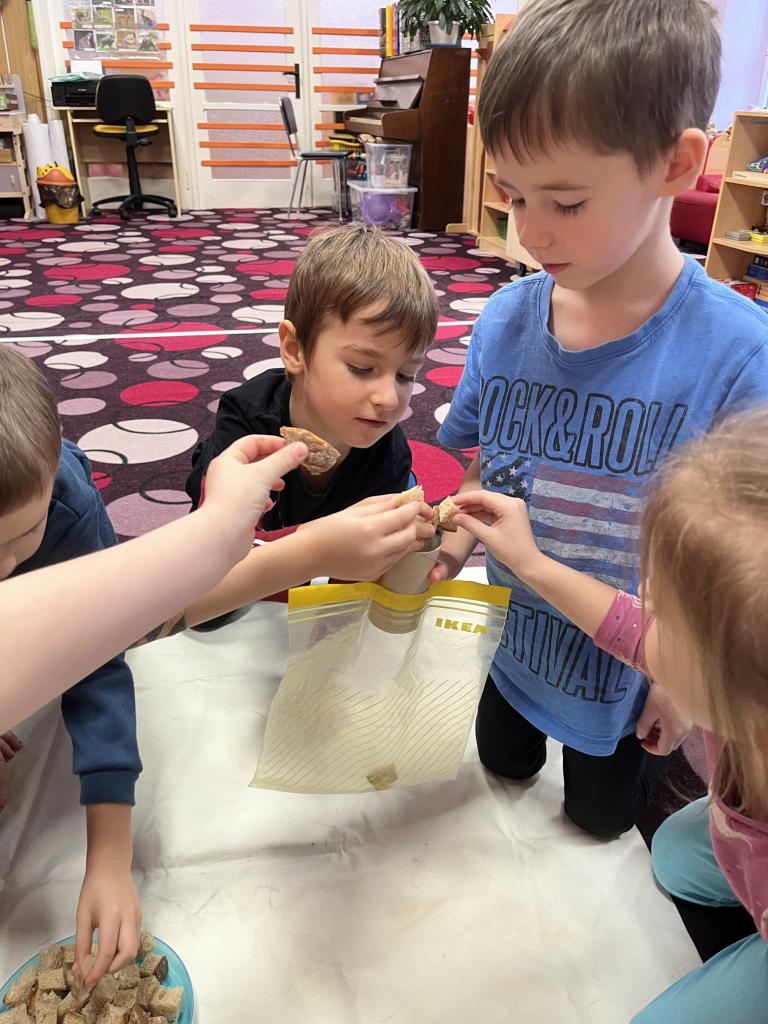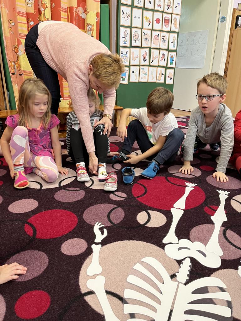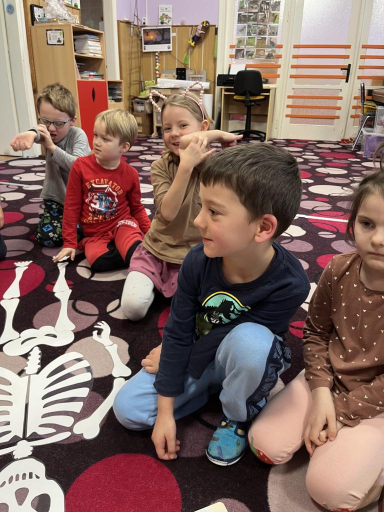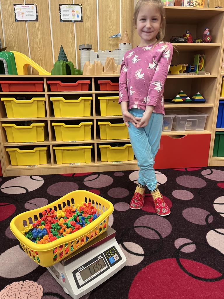 S Braillovým písmem, pomocí kterého jsme si napsali název „Sluníčka“. Prošly si cestu kolem překážek se zavázanýma očima nebo se mohly nechat vést se zavázanýma očima kamarádem. Jak se dorozumívají neslyšící? Znakovou řečí, kterou jsme si také ukázali a sami pomocí videa i vyzkoušeli. Procvičili si zrak určováním tvarů různé velikosti. Jestli máme v pořádku hmat jsme vyzkoušeli hledáním stejných povrchů. A nezapomněli jsme ani na čich, který jsme procvičili hledáním vůní. Jaké máme vlastně chutě? Na které části jazyku se nacházejí? Toto jsme si také nezapomněli ukázat a vyzkoušet. Sestavili si kostru člověka, ukázali, jak by vypadala ruka bez kostí a proč jsou v těle důležité stejně jako vše co naše tělo má. Pracovali s knihou Lidské tělo – Albi tužka. Když jsme zjistili, že si člověk nedokáže sám olíznout loket copak se asi stalo? 😊 Stihli jsme toho mnohem více. A jako bonus děti hledaly odpověď na otázku: „Kolik váží lidský mozek?“ Měly za úkol najít hračku nebo cokoli, co může vážit stejně jako náš mozek 😊. A kdo měl nejbližší odhad? Na to vám odpoví fotky 😊.