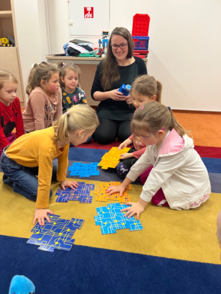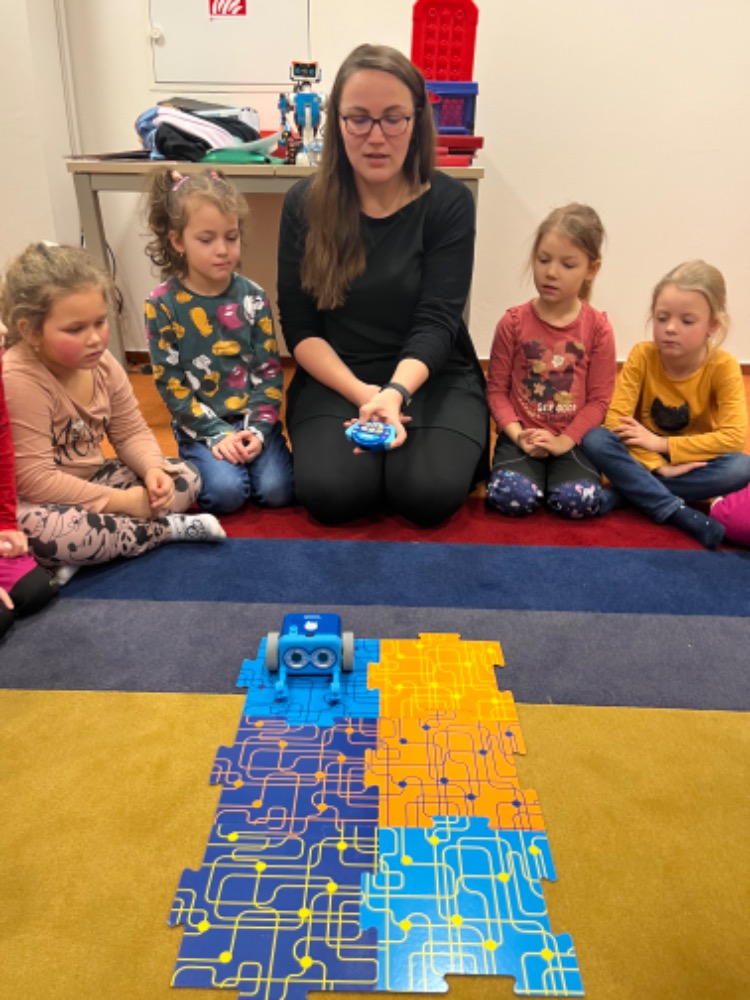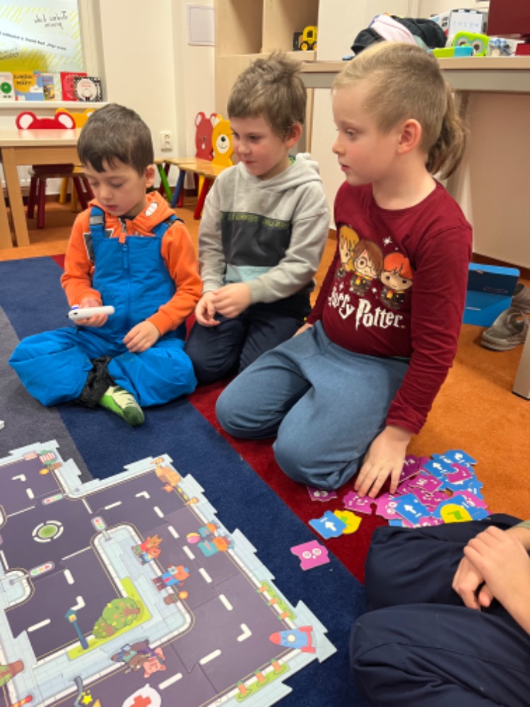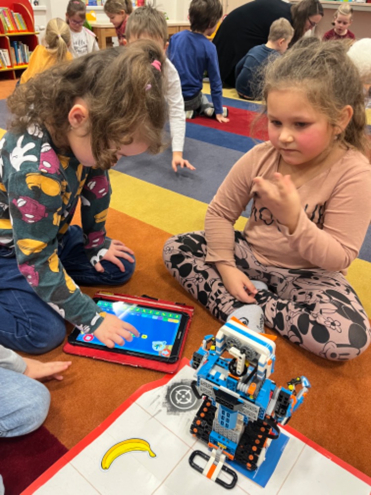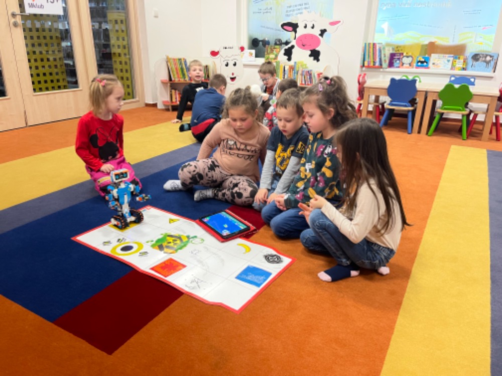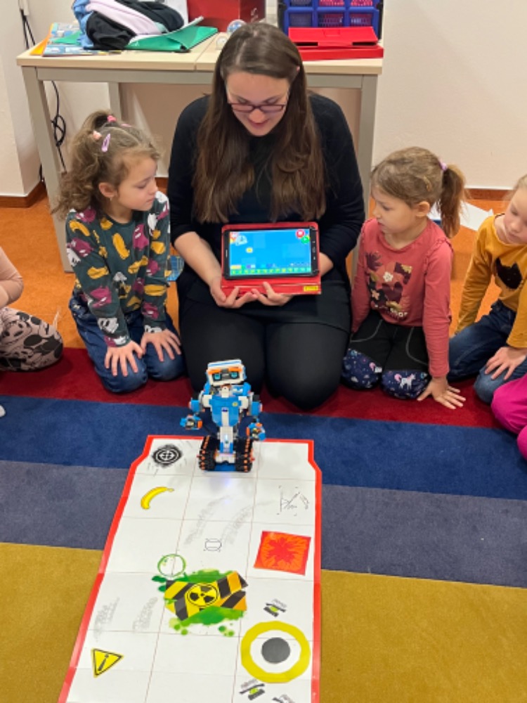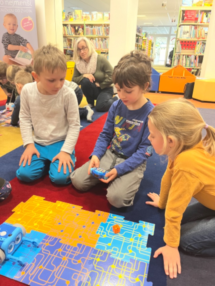 V knihovně nás čekalo nejen příjemné teplo, ale hlavně zajímavá beseda na téma Seznamte se s roboty. Děti byly nadšené. Tolik úžasných hraček, které se dají ovládat. Ne jedno dítě hlásilo, že si je koupí, že má našetřeno doma 1000,- Kč. To je ale slečna knihovnice Maruška vyvedla z omylu slovy: „Tak to vám stačit nebude“.😊 Ve fotogalerii můžete kouknout o jaké hračky se jednalo. Na začátku besedy si děti povídaly o tom, jestli také mají doma nějakého robota. Někteří ani netušili, že ho mají v podobě robotického vysávače. Pak si zahrály hru „Na roboty“. Musely dělat vše co jim Maruška řekla. No spíše jak je naprogramovala😊, protože jak již později zjistily, robot nepracuje sám podle toho, jak se mu zachce, ale vždy ho musí někdo naprogramovat. Dalším úkolem k pochopení toho, jak roboti fungují, bylo naprogramování Adámka, který měl jít tak jak mu děti řekly. Z bodu A do bodu B, přičemž nesměly zapomenout na to, že robot se pohybuje pouze dopředu, dozadu, doprava a doleva. Učily se správně plánovat cestu. Seznámily se s těmito robotickými hračkami – Botley 2.0, Makeblock mTiny Discover Kit, Lego Boost a Bee-Bot Včelkou, která pro ně však nebyla neznámá, protože ji máme ve školce. Na více robotických hraček nám již nezbyl čas. Aby si je mohly děti vyzkoušet na vlastní kůži, musely jim stačit tyhle čtyři. Další možná na jiné lekci. A teď už hurá na fotografie z tohoto dne.