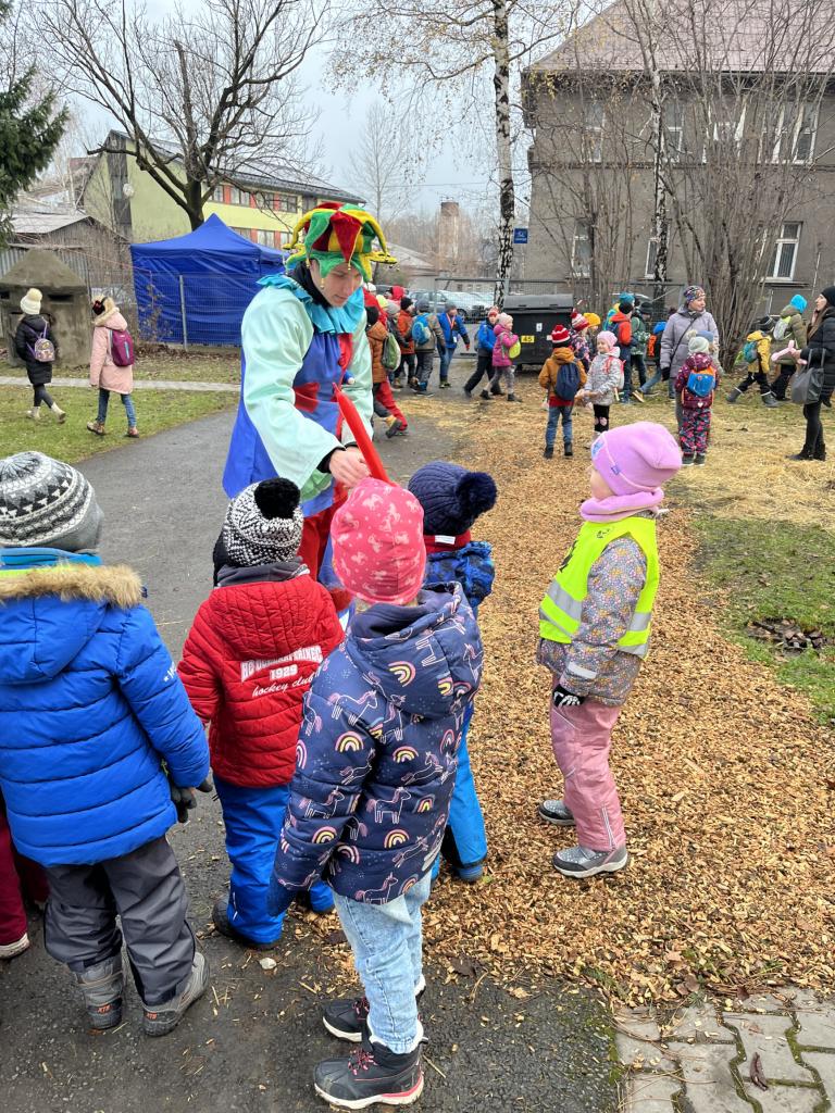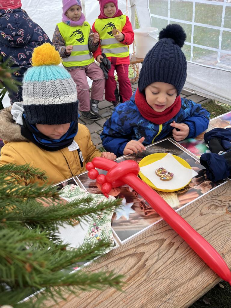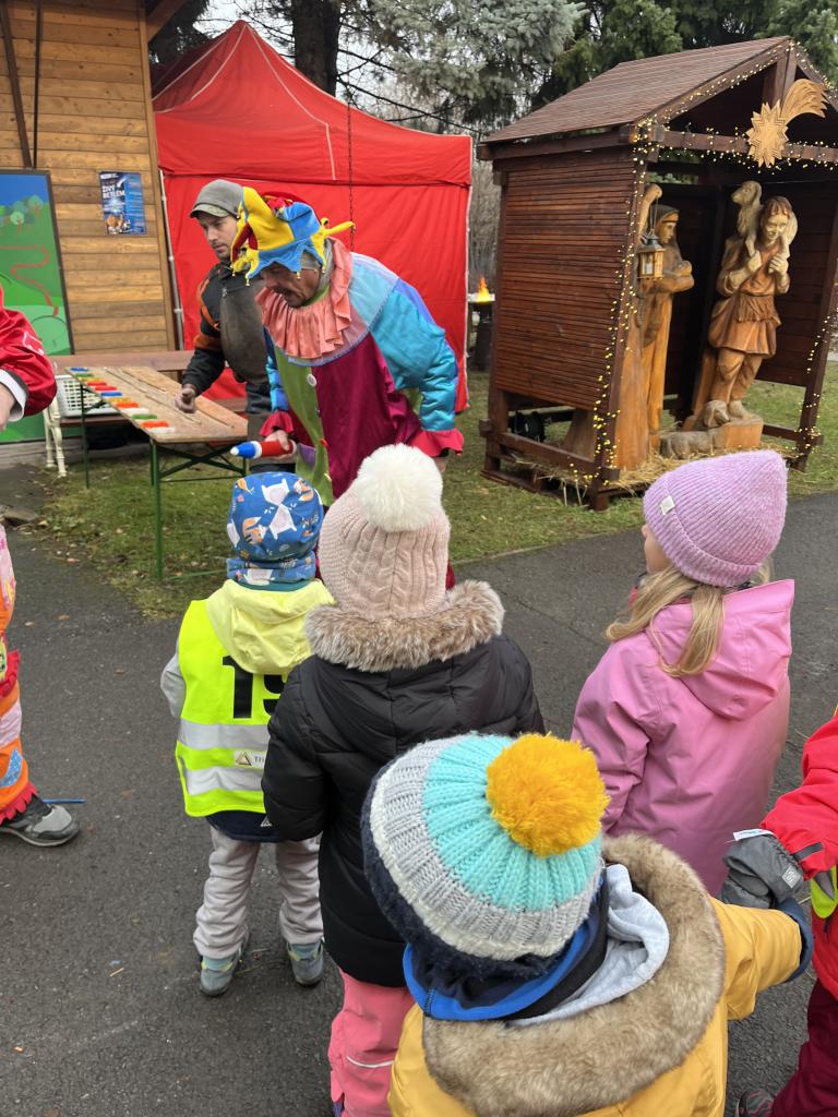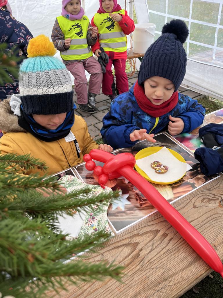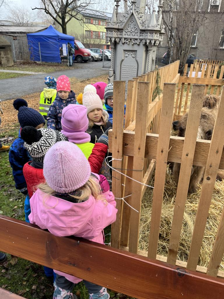 Hned po příchodu na nás čekala zvířátka. Největší oblibě se těšil velbloud, kterého jen tak někde nevidíme. Potkali jsme i Klauny z Balónkova a ti každému děťátku vyrobili z balónku zvířátko, předmět podle jejich přání. Nevíme, jestli to bylo zimou nebo balónky, ale nikomu to nevydrželo ani cestu do školky ☹ a z každého balónku vznikla každému pouze dlouhá „žížala“, jak to nazvaly děti 😊. Měli jsme možnost podívat se na historická řemesla, košíkářství, kovářství, drátenictví, řezbářství, zdobení baněk a perníčků, které si děti vyzkoušely na vlastní kůži a za odměnu si mohly své dílo sníst 😊.