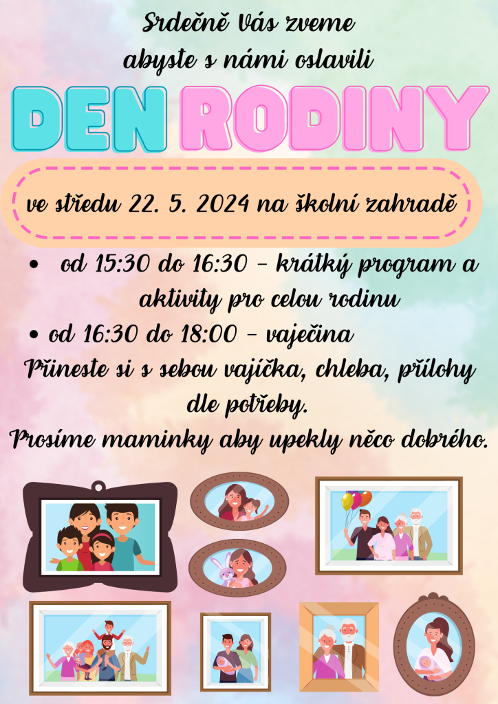 Ve středu 22. 5. 2024 budeme mít na školní zahradě Den rodiny.