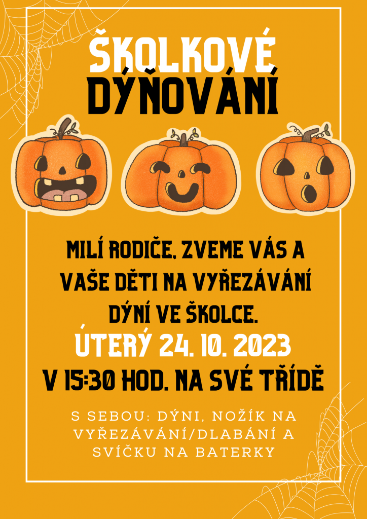 V úterý 24. 10. od 15:30 budeme ve školce vyřezávat dýně. S sebou: dýni, nožík na vyřezávání/dlabání a svíčku na baterky. Budeme se na Vás moc těšit!