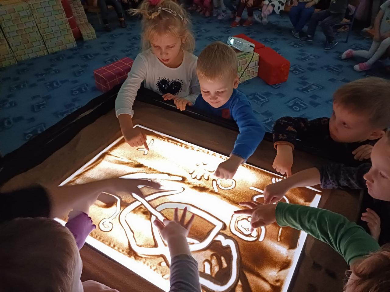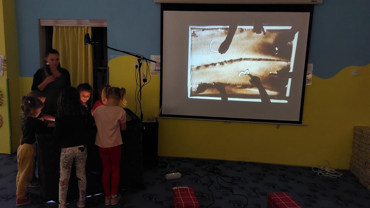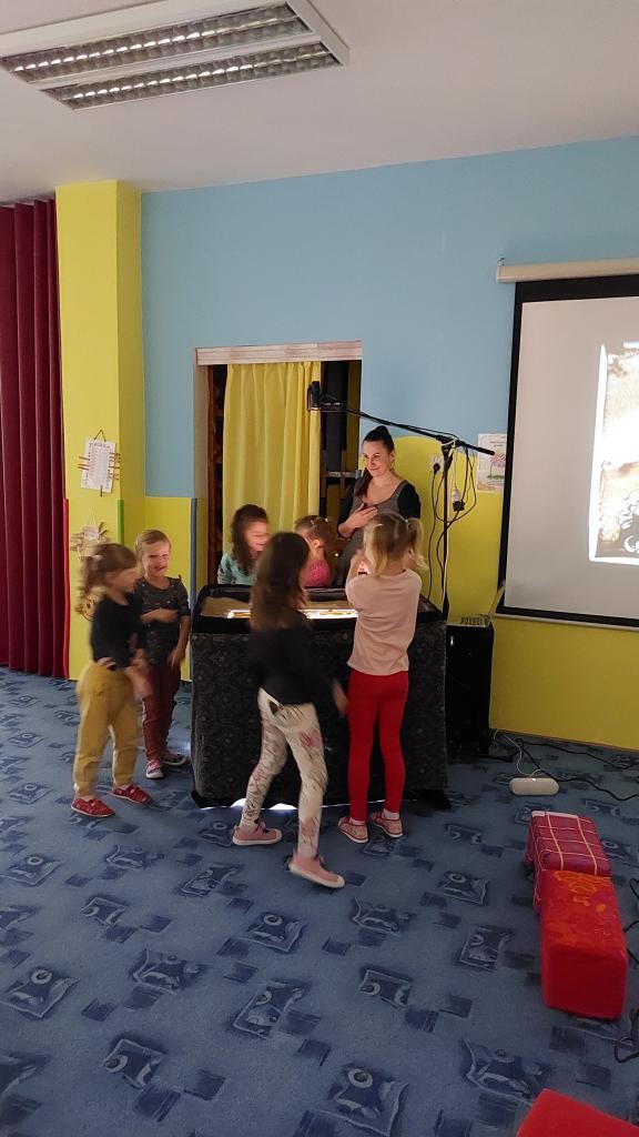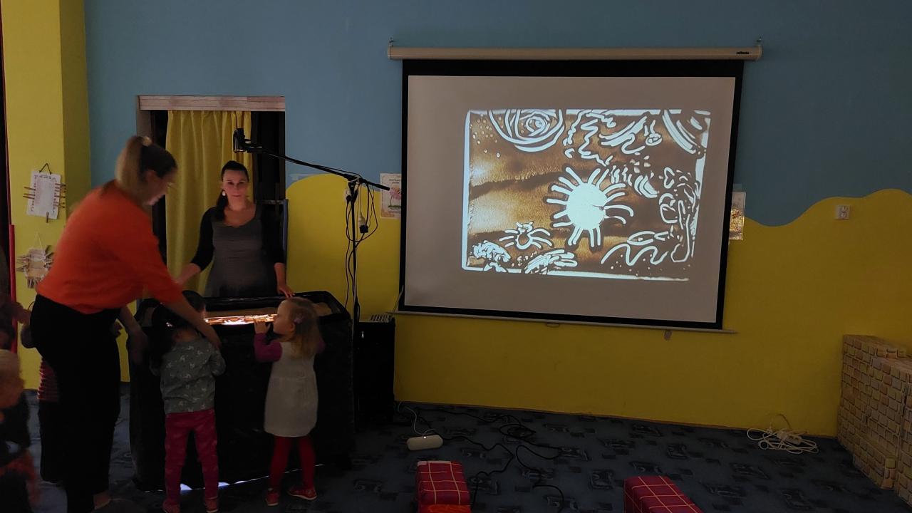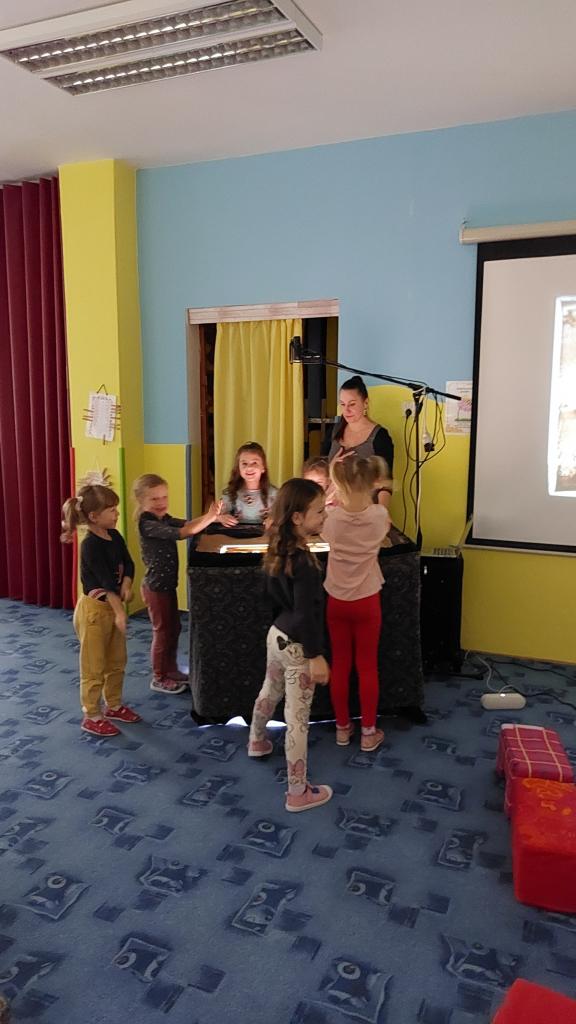 Písečná animace je kreslení příběhu v písku za doprovodu hudby, vše se snímá kamerou a přes projektor promítá na plátno. Děti měly možnost zhlédnout dvě přibližně desetiminutové animace. První byla zaměřena na pohádkové postavy a ta druhá na zvířata. Poté si děti měly možnost samy toto pískohraní vyzkoušet. Ostatní zatím hádali, co kreslí. Tato výtvarná technika měla u dětí velký úspěch, hezky je ztišila a uklidnila. Opakovaně chtěly kreslit do písku. Možná paní Koňařovou opět pozveme a mohla by nám předvést vodní animaci, kterou také předvádí.