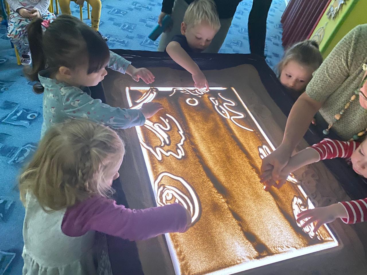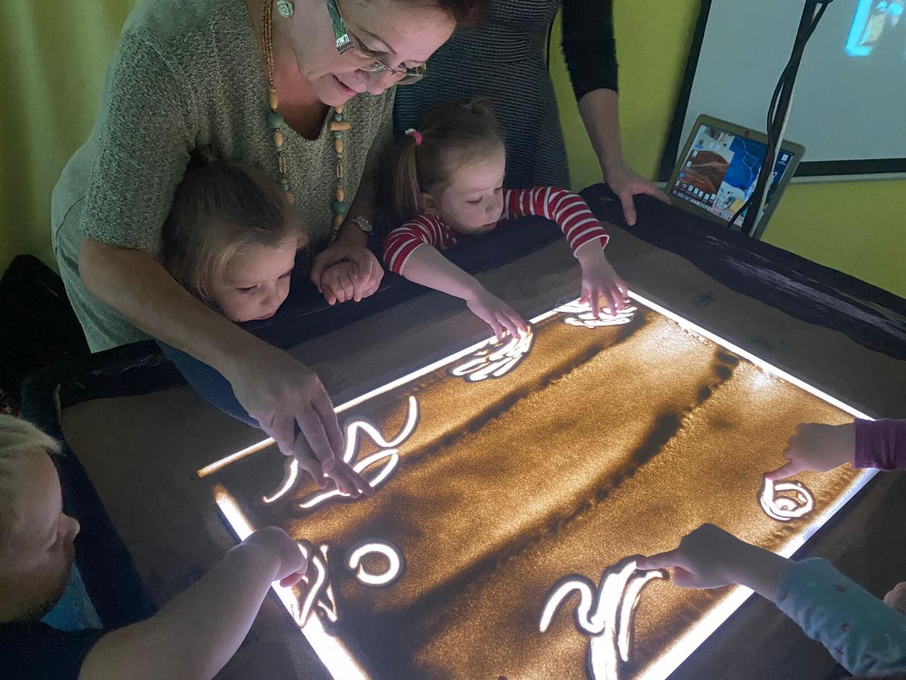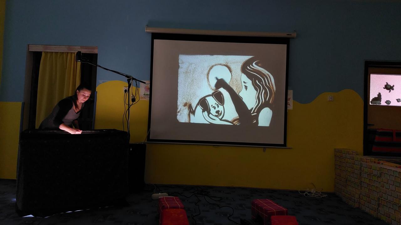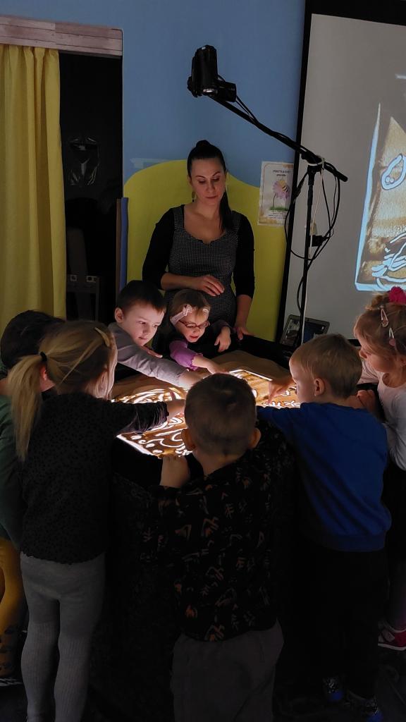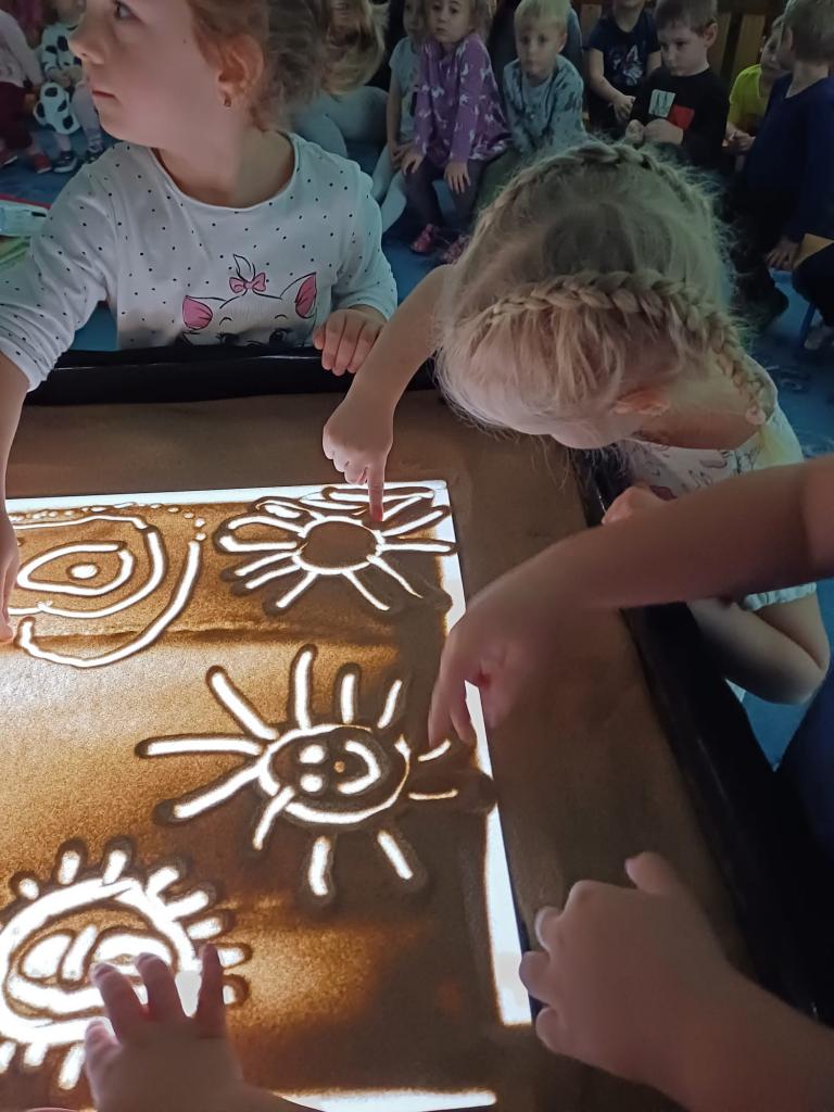 Písečná animace je kreslení příběhu v písku za doprovodu hudby, vše se snímá kamerou a přes projektor promítá na plátno. Děti měly možnost zhlédnout dvě přibližně desetiminutové animace. První byla zaměřena na pohádkové postavy a ta druhá na zvířata. Poté si děti měly možnost samy toto pískohraní vyzkoušet. Ostatní zatím hádali, co kreslí. Tato výtvarná technika měla u dětí velký úspěch, hezky je ztišila a uklidnila. Opakovaně chtěly kreslit do písku. Možná paní Koňařovou opět pozveme a mohla by nám předvést vodní animaci, kterou také předvádí.