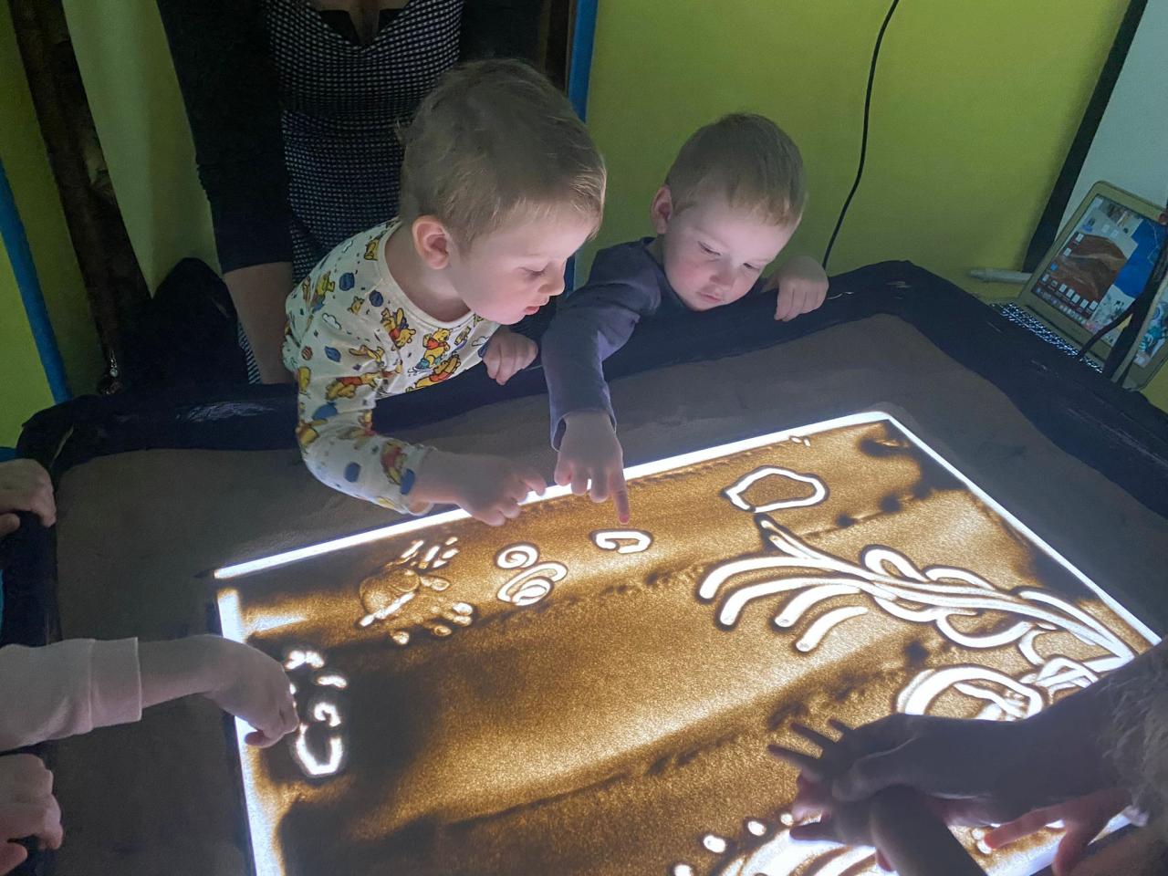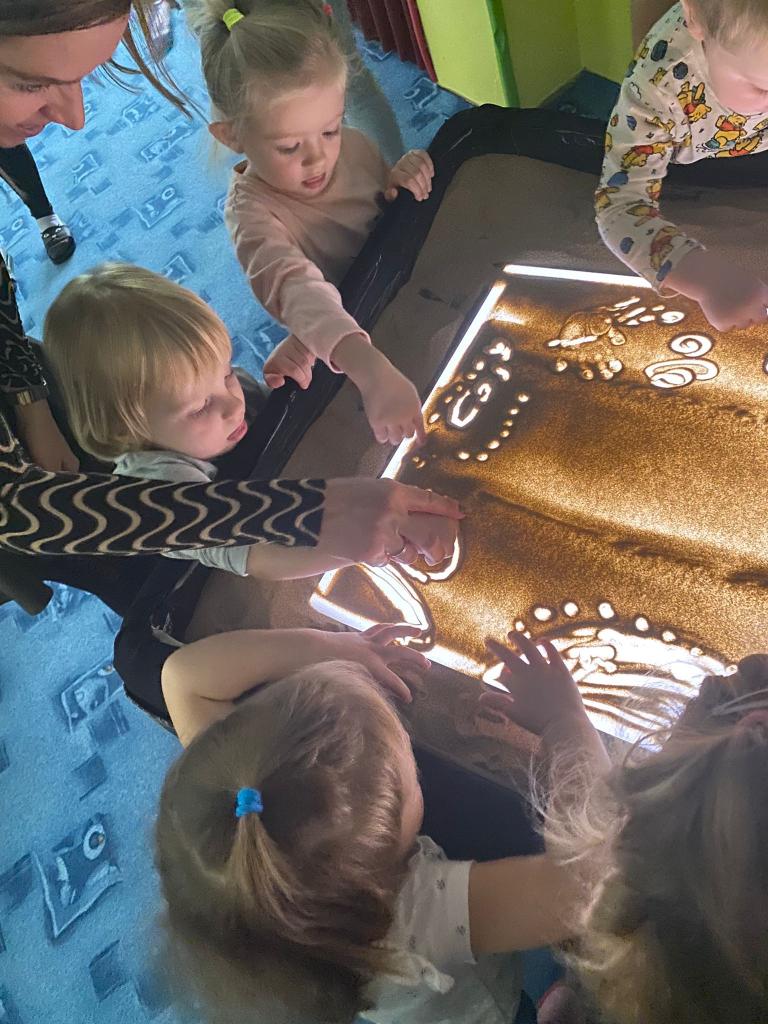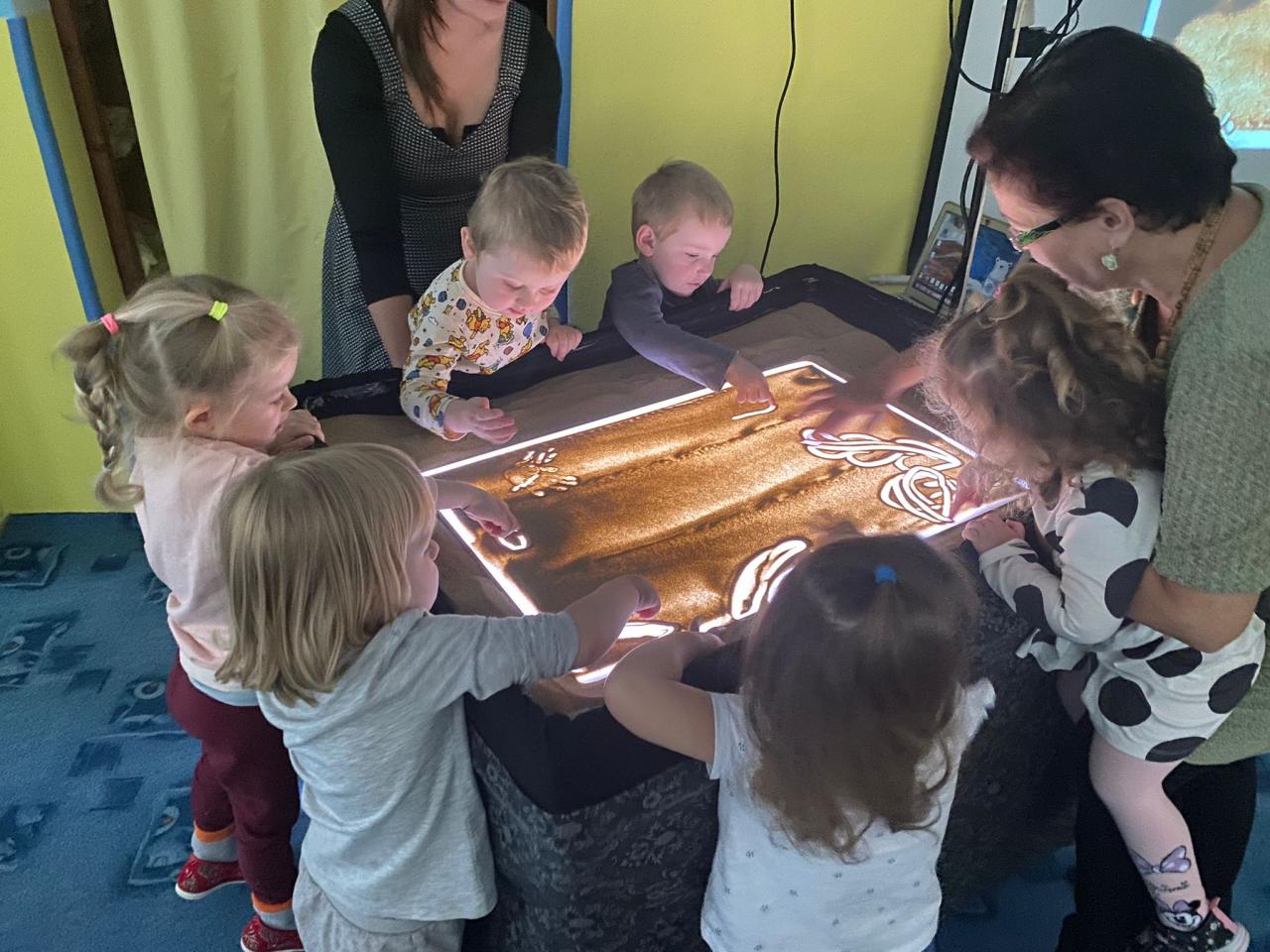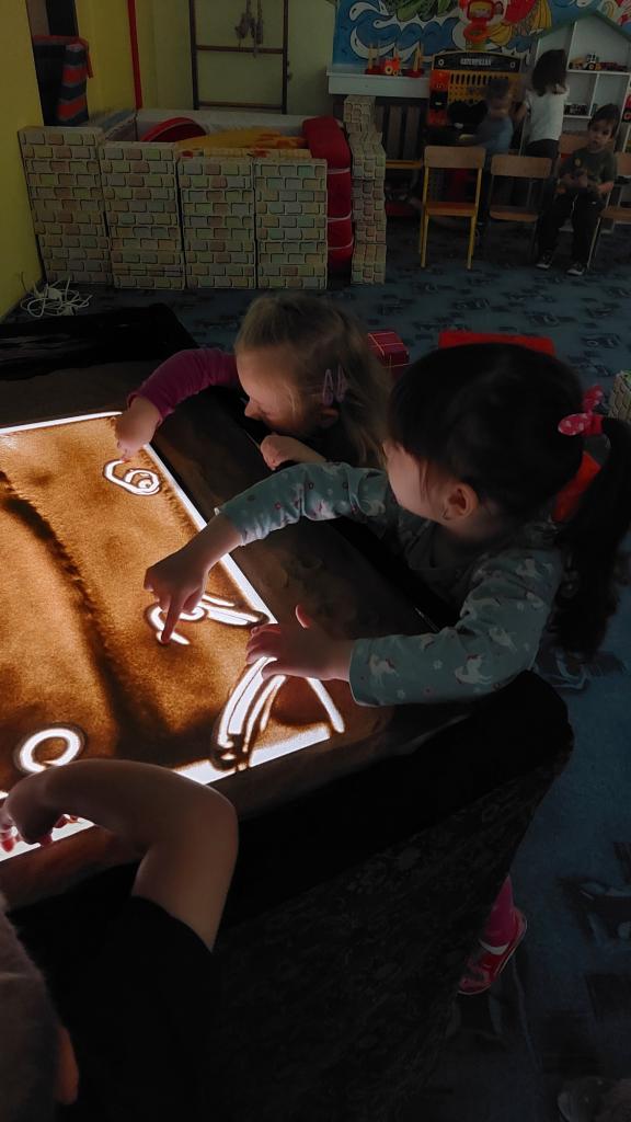 Písečná animace je kreslení příběhu v písku za doprovodu hudby, vše se snímá kamerou a přes projektor promítá na plátno. Děti měly možnost zhlédnout dvě přibližně desetiminutové animace. První byla zaměřena na pohádkové postavy a ta druhá na zvířata. Poté si děti měly možnost samy toto pískohraní vyzkoušet. Ostatní zatím hádali, co kreslí. Tato výtvarná technika měla u dětí velký úspěch, hezky je ztišila a uklidnila. Opakovaně chtěly kreslit do písku. Možná paní Koňařovou opět pozveme a mohla by nám předvést vodní animaci, kterou také předvádí.