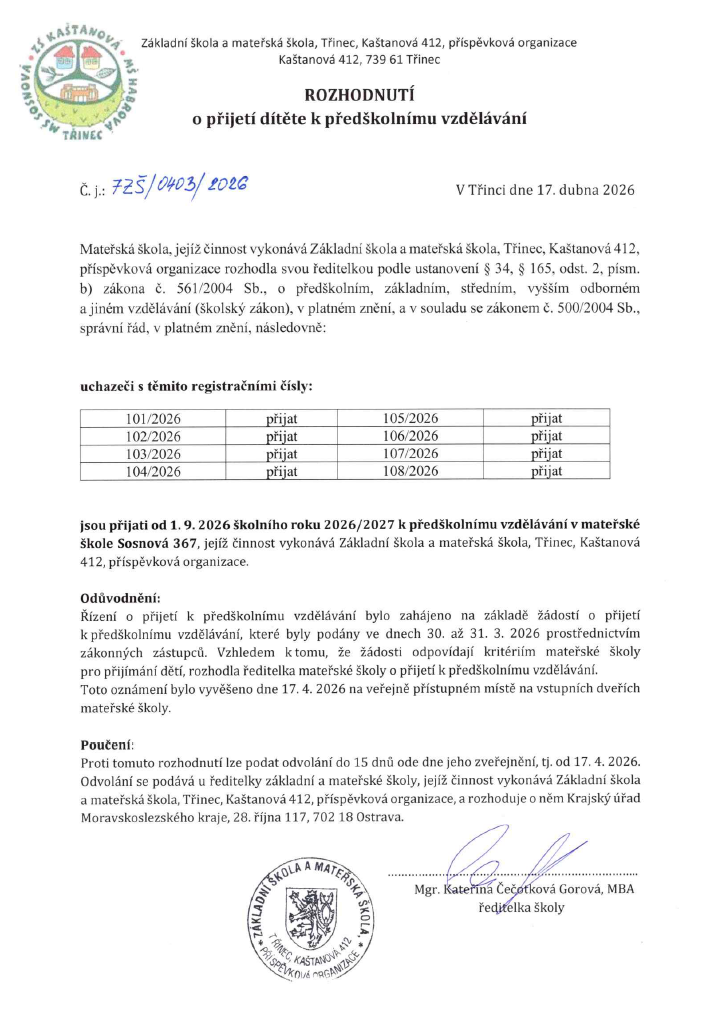 Rozhodnutí o přijetí k předškolnímu vzdělávání v mateřské škole Sosnová 367 pro školní rok 2026/2027.