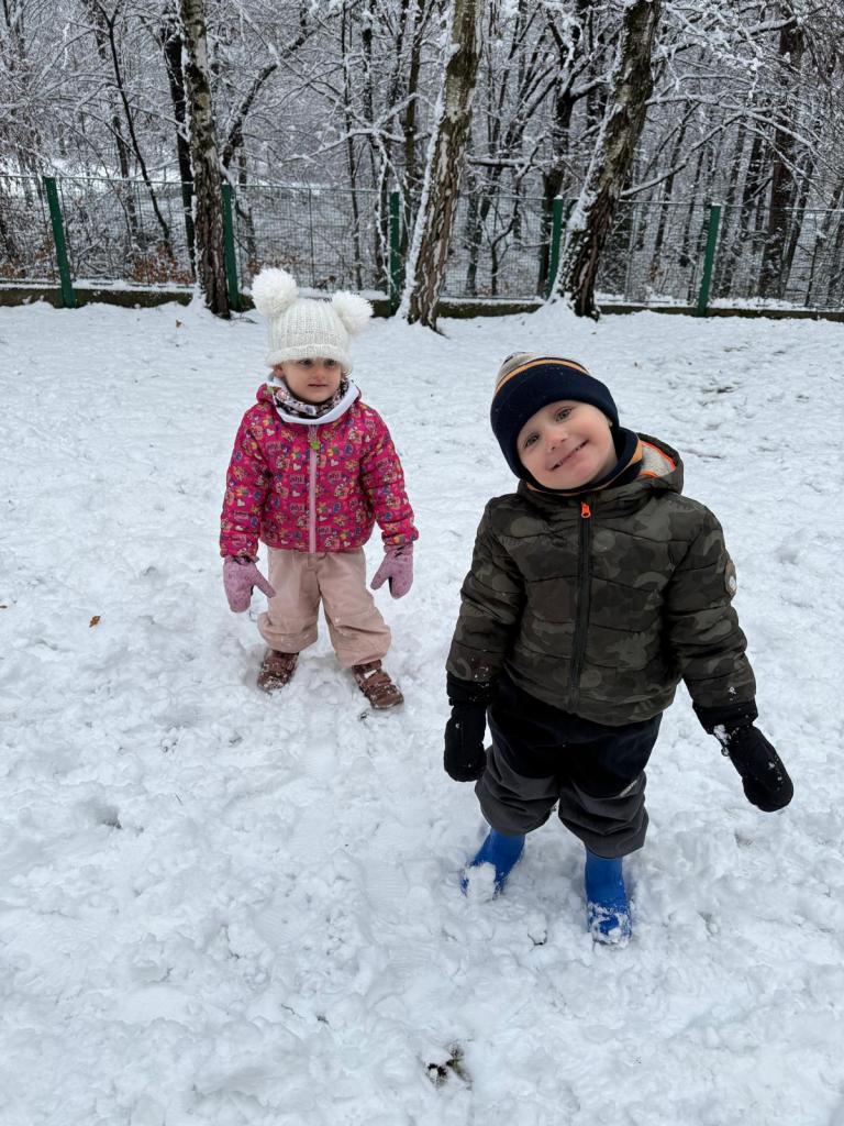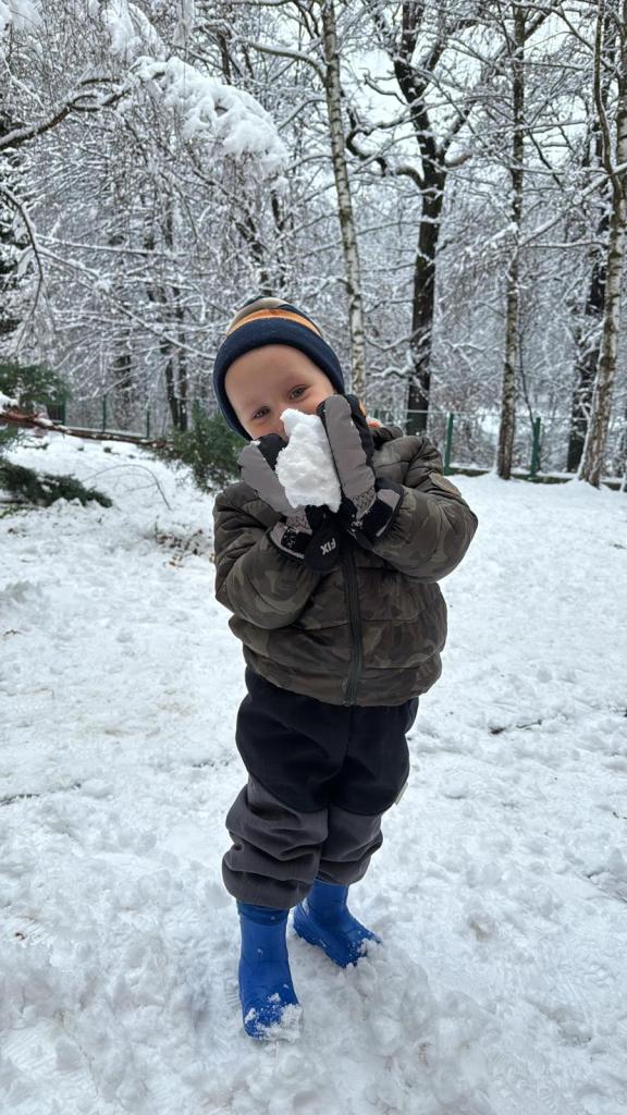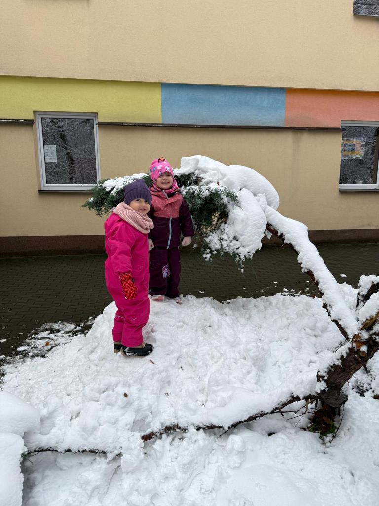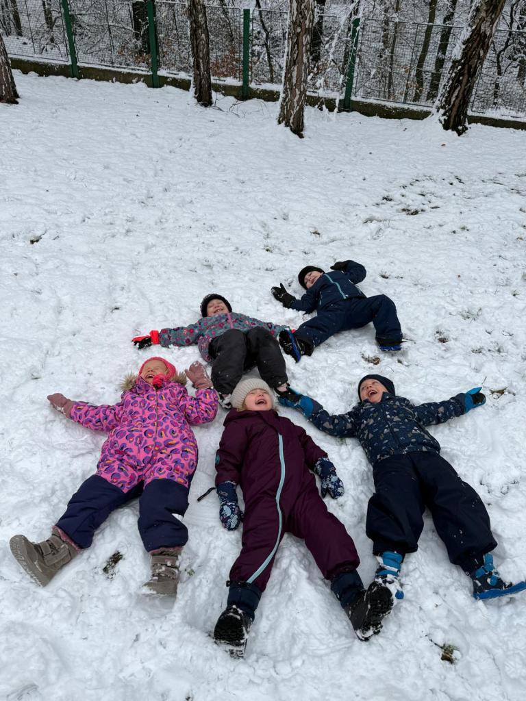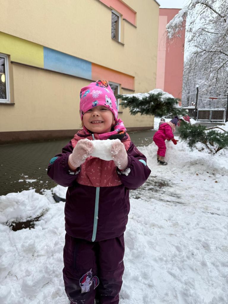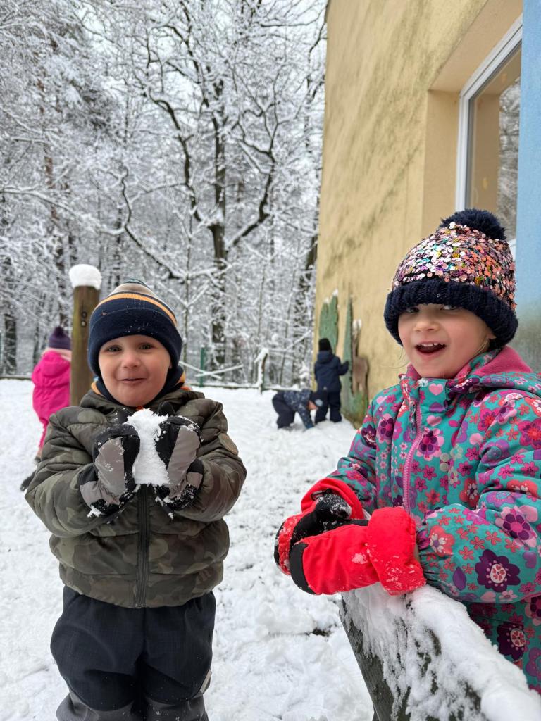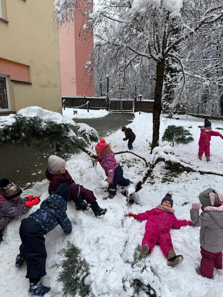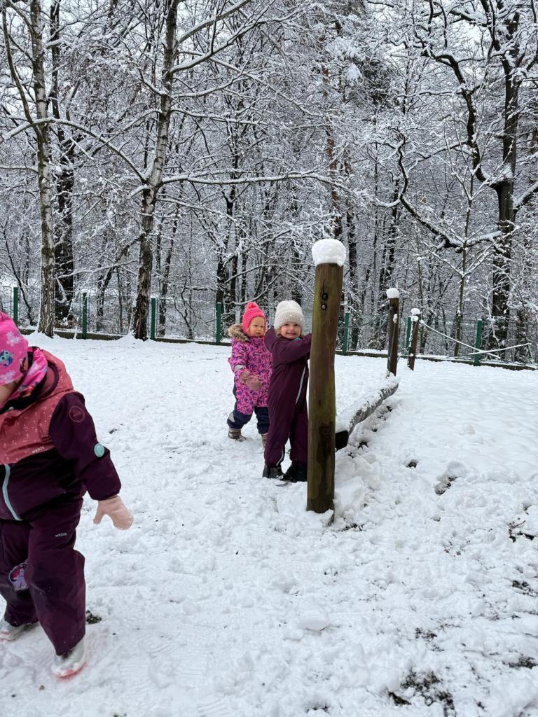Když napadl sníh, vyrazili jsme na zahradu, kde děti objevovaly zimní hrátky – stavěly malé sněhuláky, tvořily stopy ve sněhu, kutálely koule a užívaly si společný čas venku. Smích, červené tváře a radost z pohybu byly tou nejlepší odměnou!