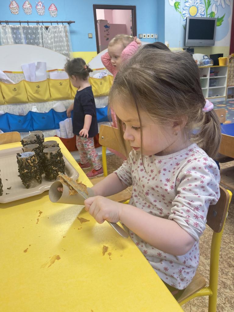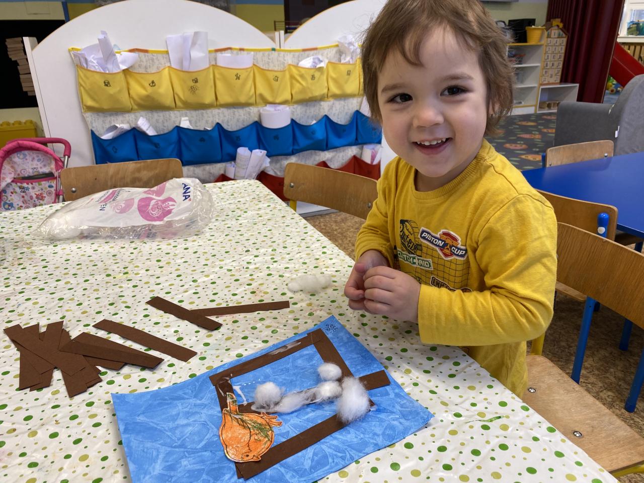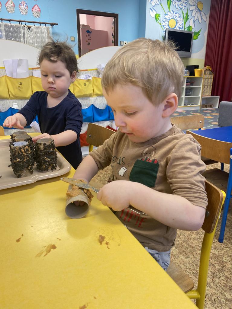 Nezapomněli jsme ani na ptáčky, které jsme si nejdříve vybarvili a následně jsme z papíru vyrobili krmítka i s vatovým sněhem. Krmítka jsme vyrobili i opravdové – na ruličku jsme namazali arašídové máslo a obalili jsme ji v semínkách. Děti si své výrobky vzaly na zahradu, kde jsme je pověsili na větvičky.