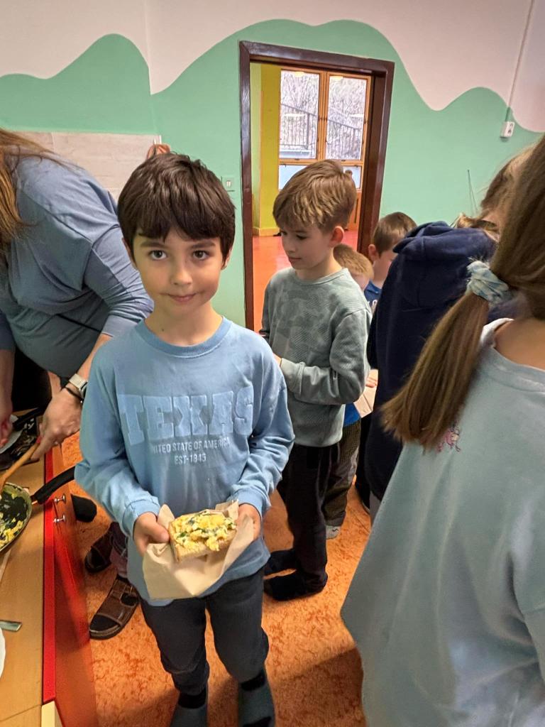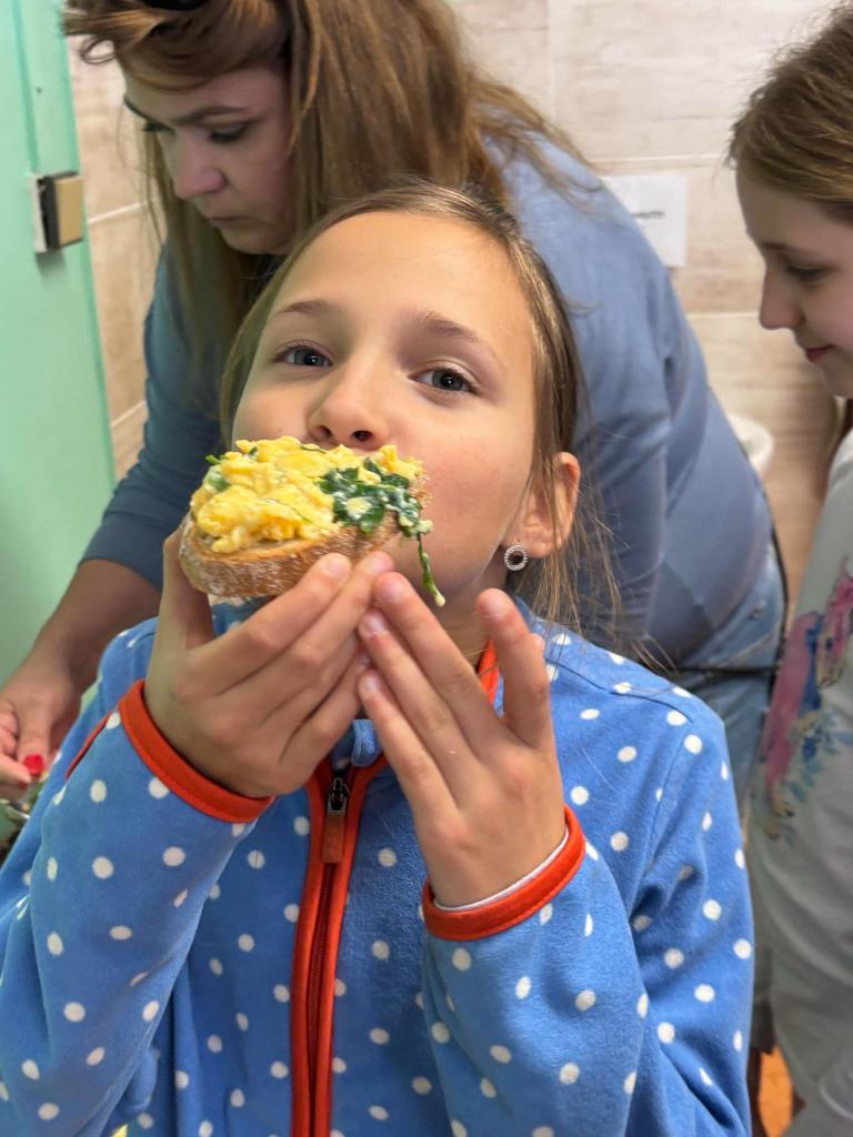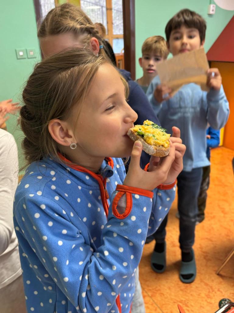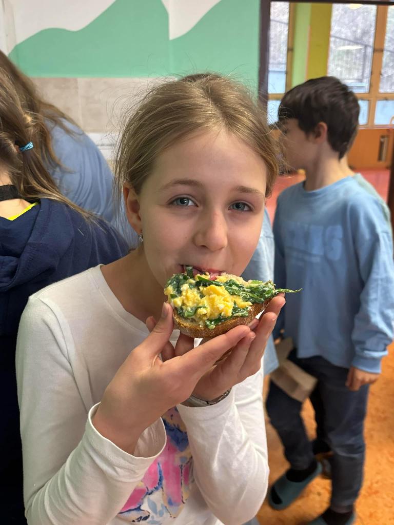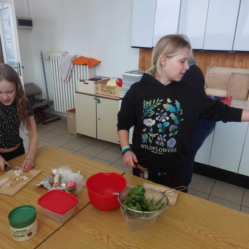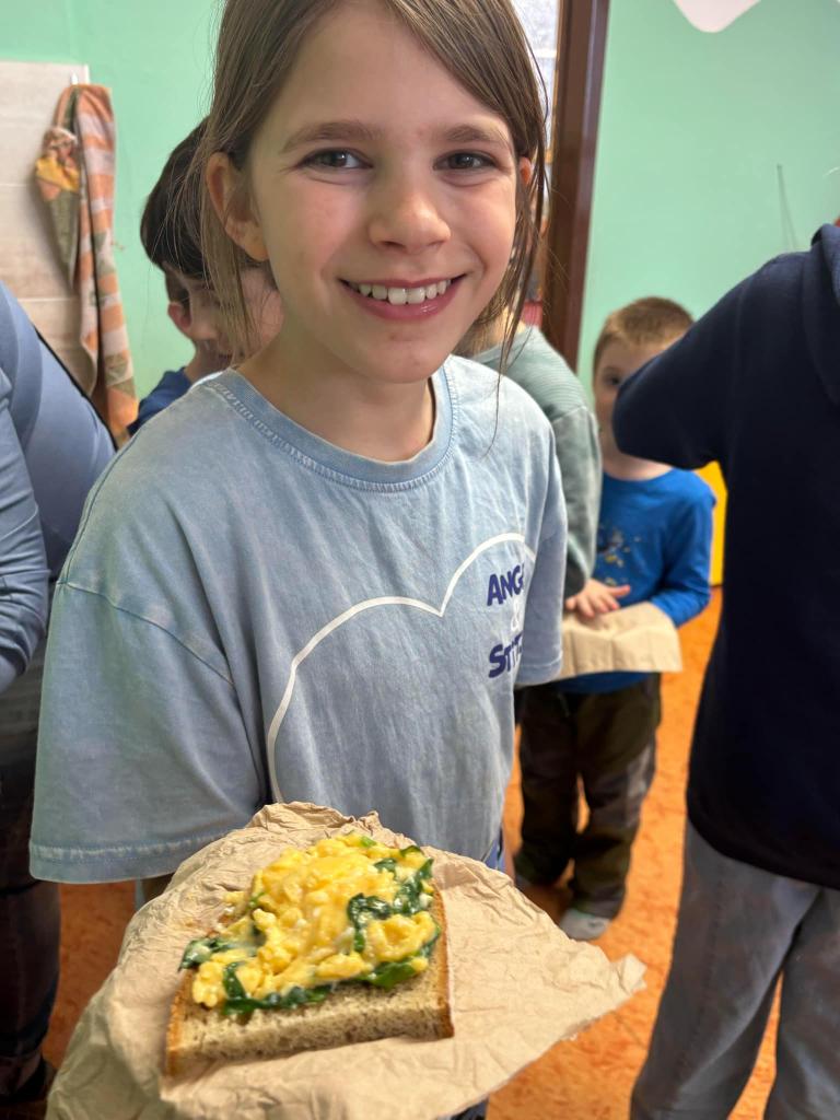 Vyfoukali jsme si vajíčka na zdobení a ve školní kuchyňce si připravili dobrotu - vaječinu s medvědím česnekem, ale také bez. To byla dobrota.....