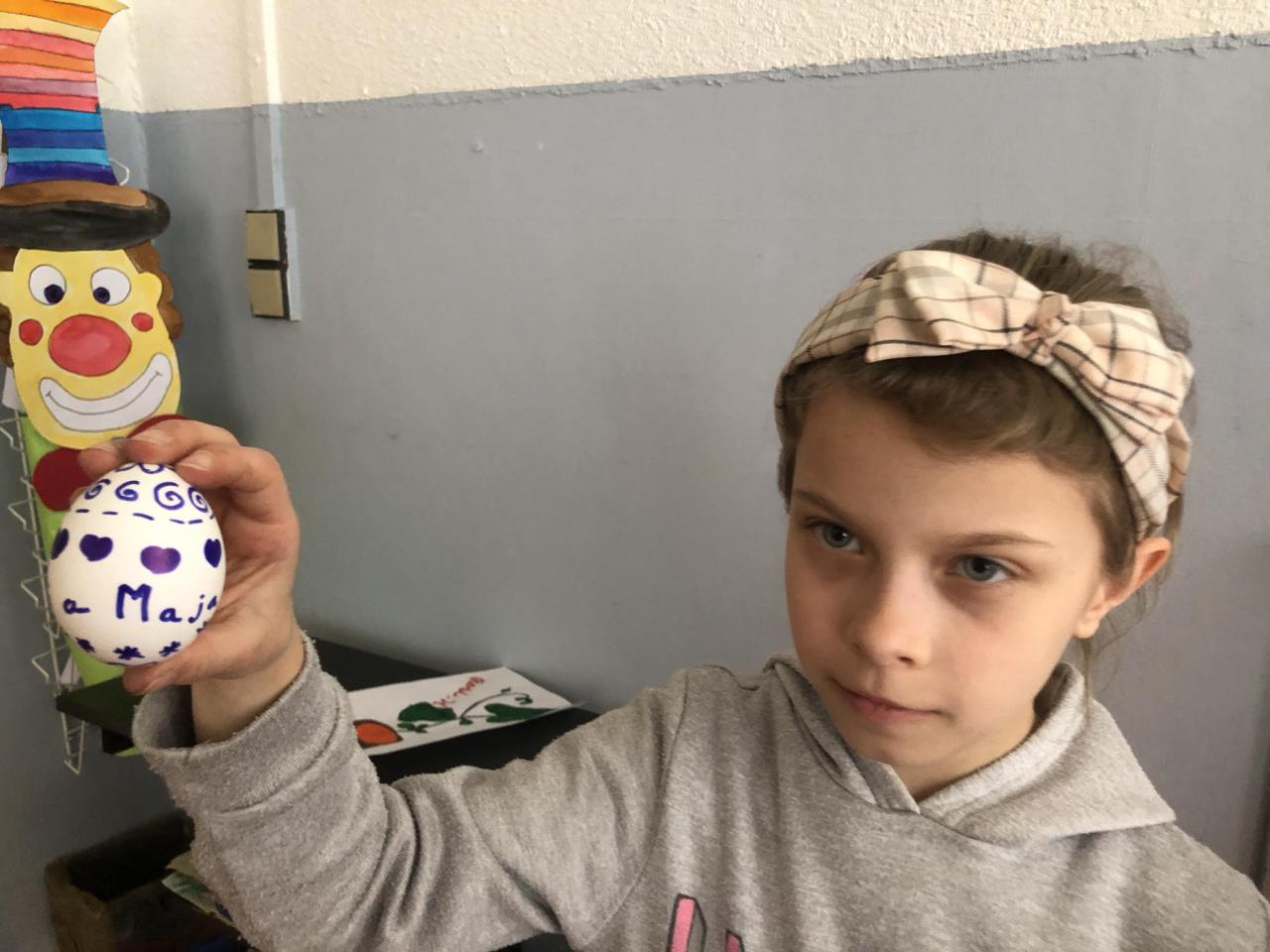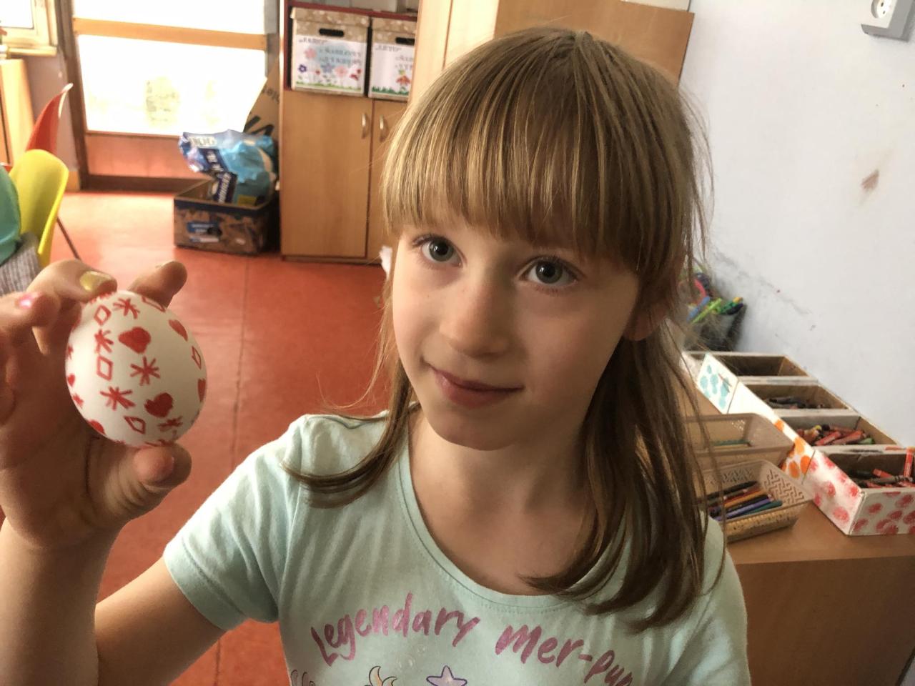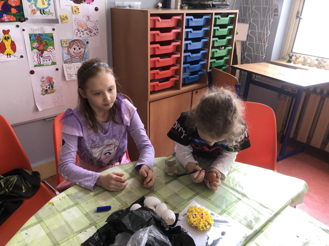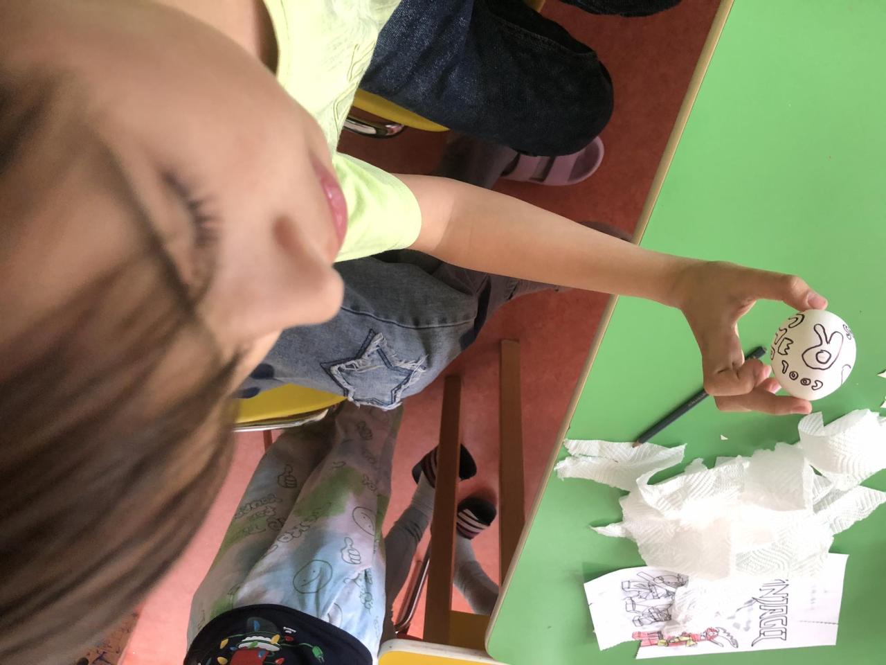 Volná tvorba dětí ve školní družině. Jen vajíčko a lihový fix.