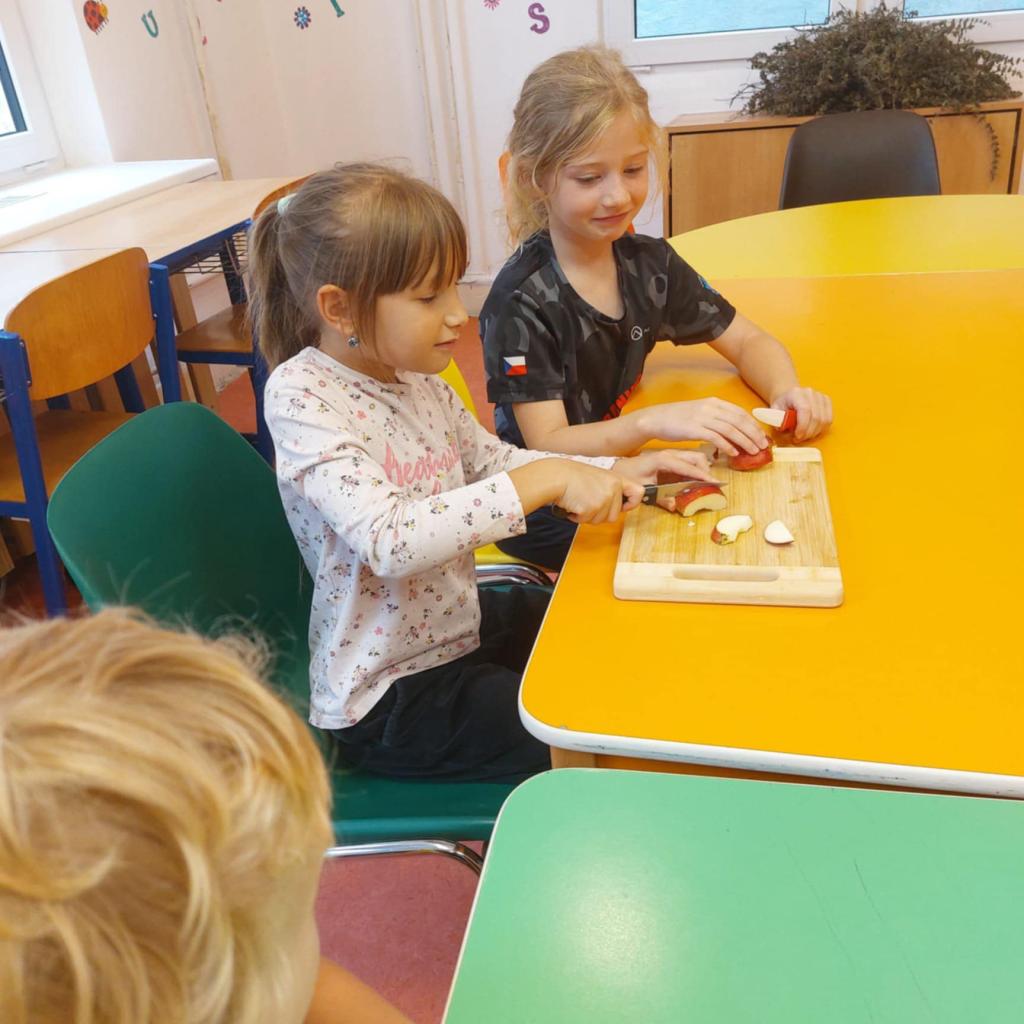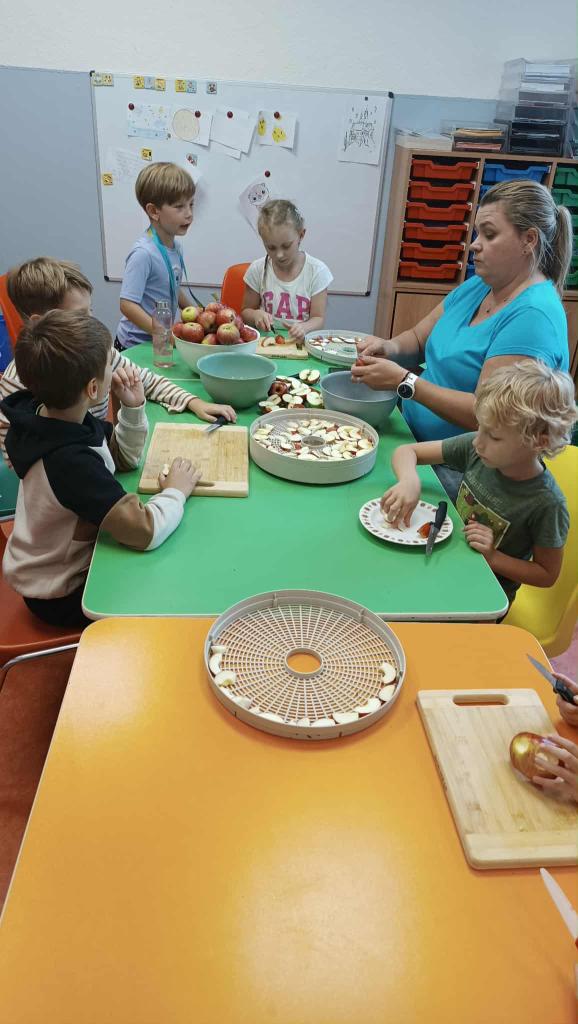 Paní vychovatelky Uršula a Monika mají spoustu opadaných jablek. My jsme začali krájet a sušit na zimu.