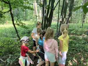 Zkoumání okolí školy, pozorování přírody, pozdrav stromům, důvěra.